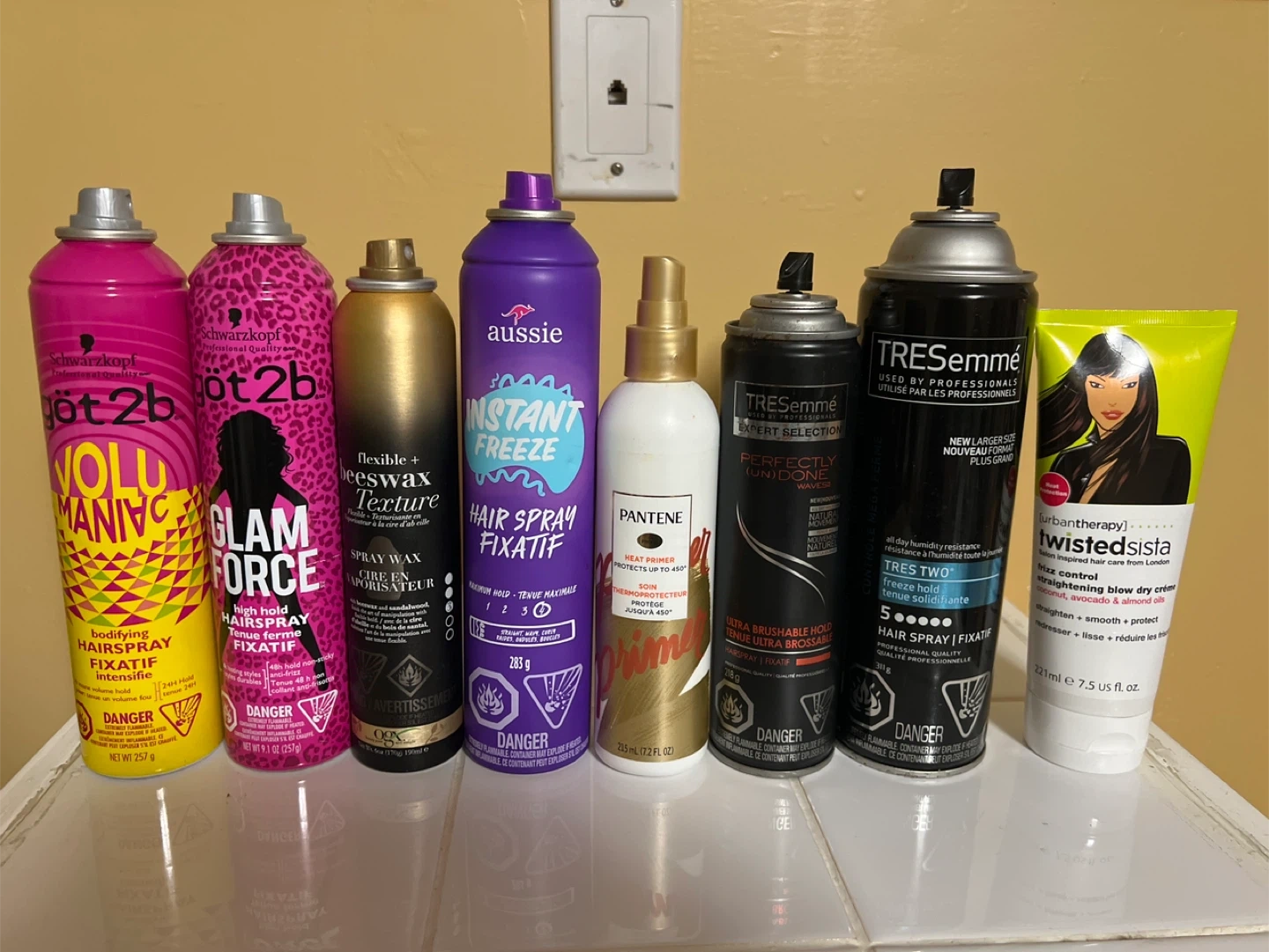 65Selling a variety of hair styling products! (no caps, used) Includes: - Schwarzkopf got2b Volumania Hairspray - Schwarzkopf got2b Glam Force Hairspray - Aussie Instant Freeze Hairspray - TRESemmé Tres Two Hairspray - TRESemmé Perfectly (Un) Done Waves Hairspray - Pantene Heat Primer - Twisted Sista Straightening Blow Dry Crème - OGX Flexible + Beeswax Texture Spray Wax