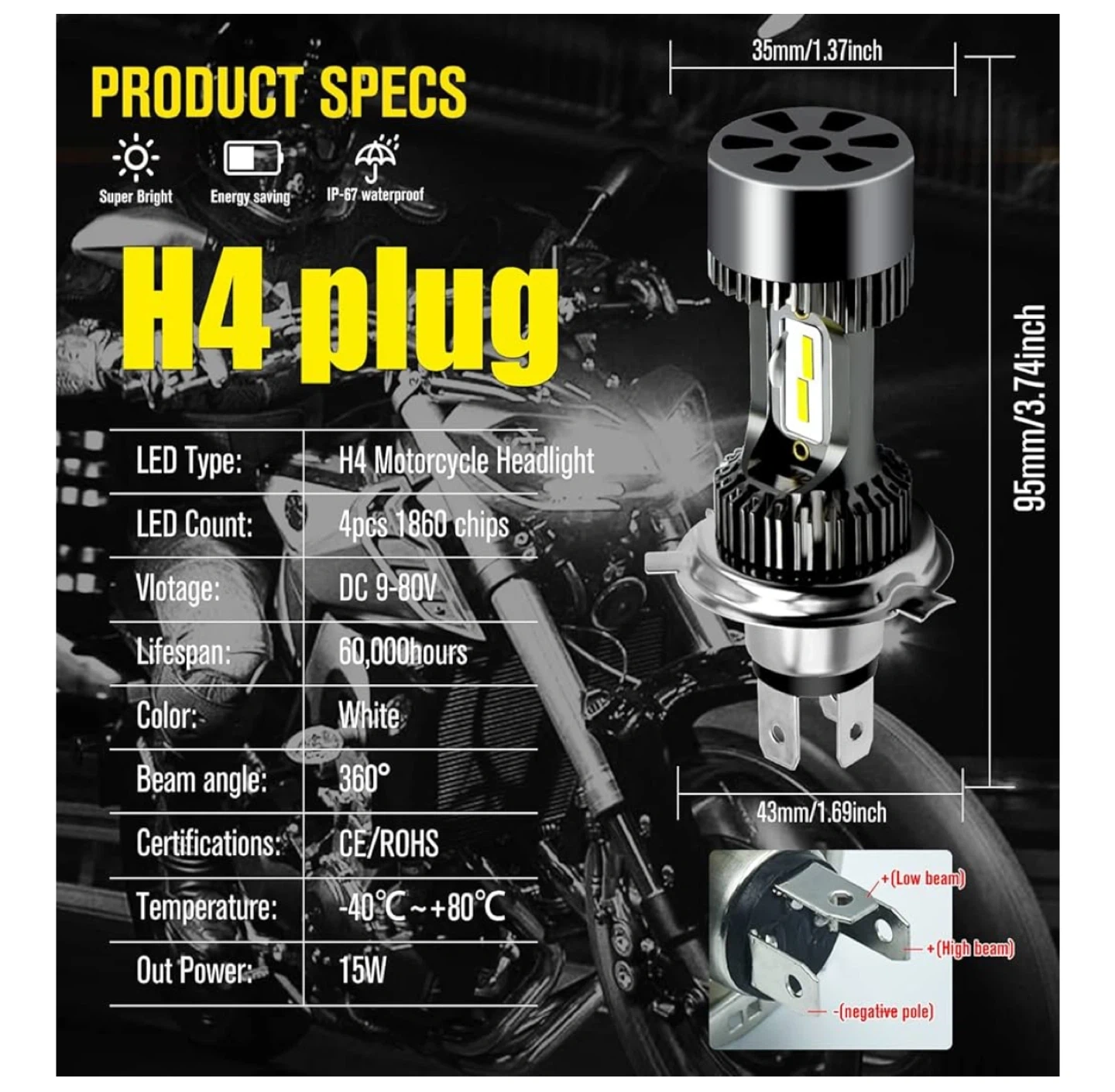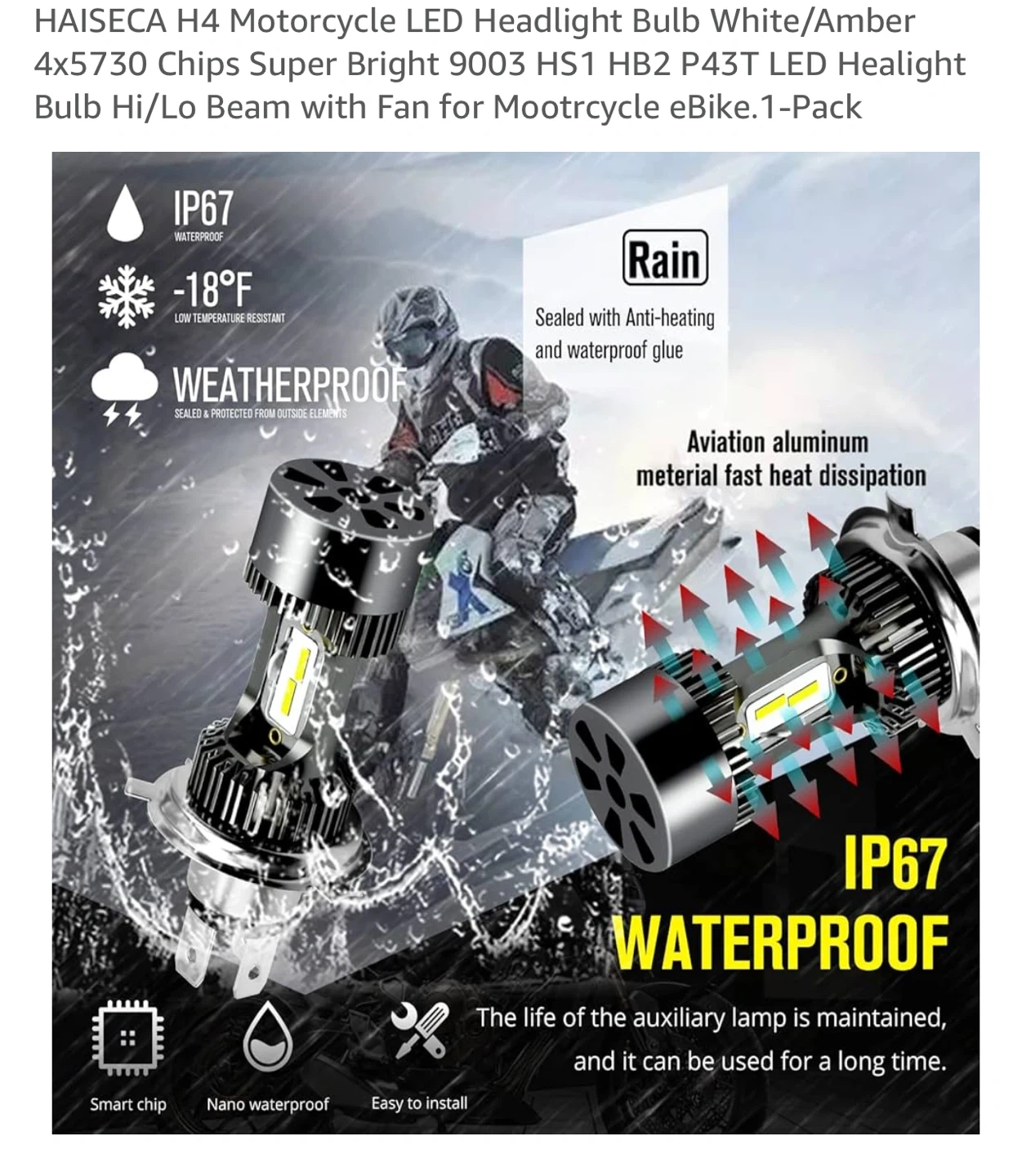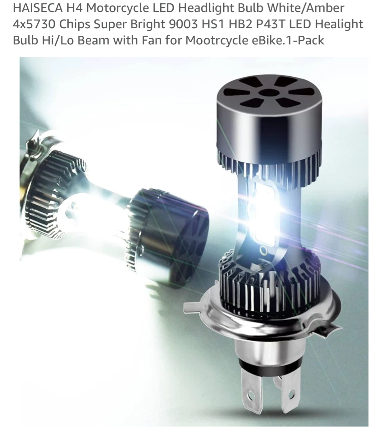 Selling a HAISECA H4 Motorcycle LED Headlight Bulb. It features a super bright white/amber light with 4x5730 chips. It's designed with a fan for motorcycle, ebike, and more. The bulb is IP67 waterproof and easy to install.