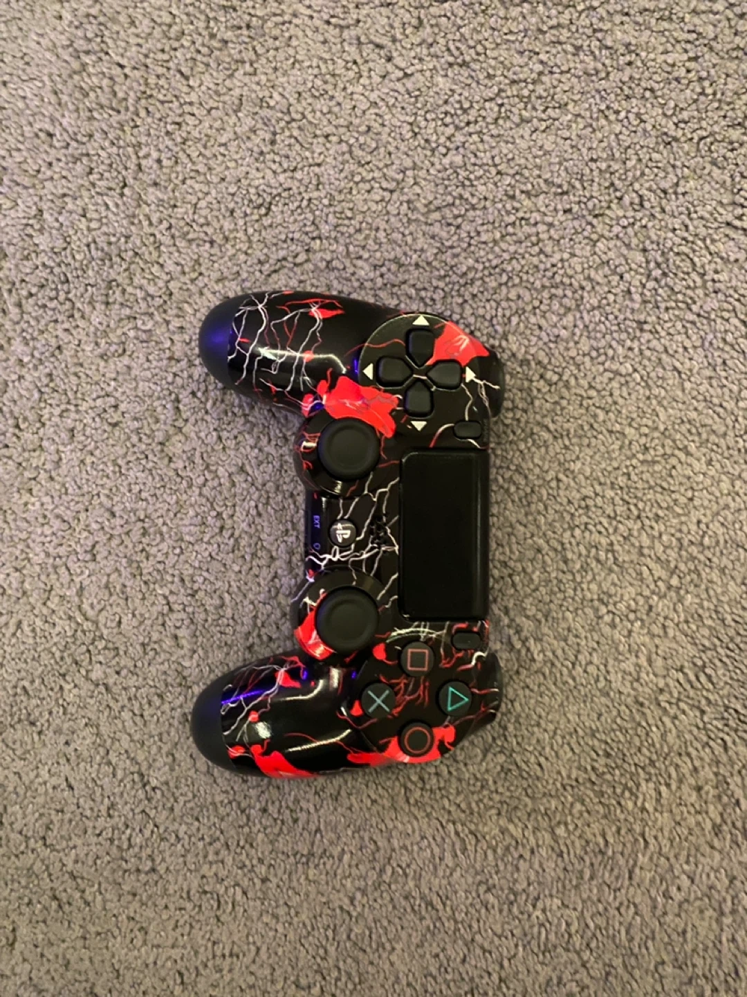 Selling a used PlayStation 4 (PS4) controller. It has a custom design with black, red, and white lightning bolt patterns. It's in good condition and ready for a new home!