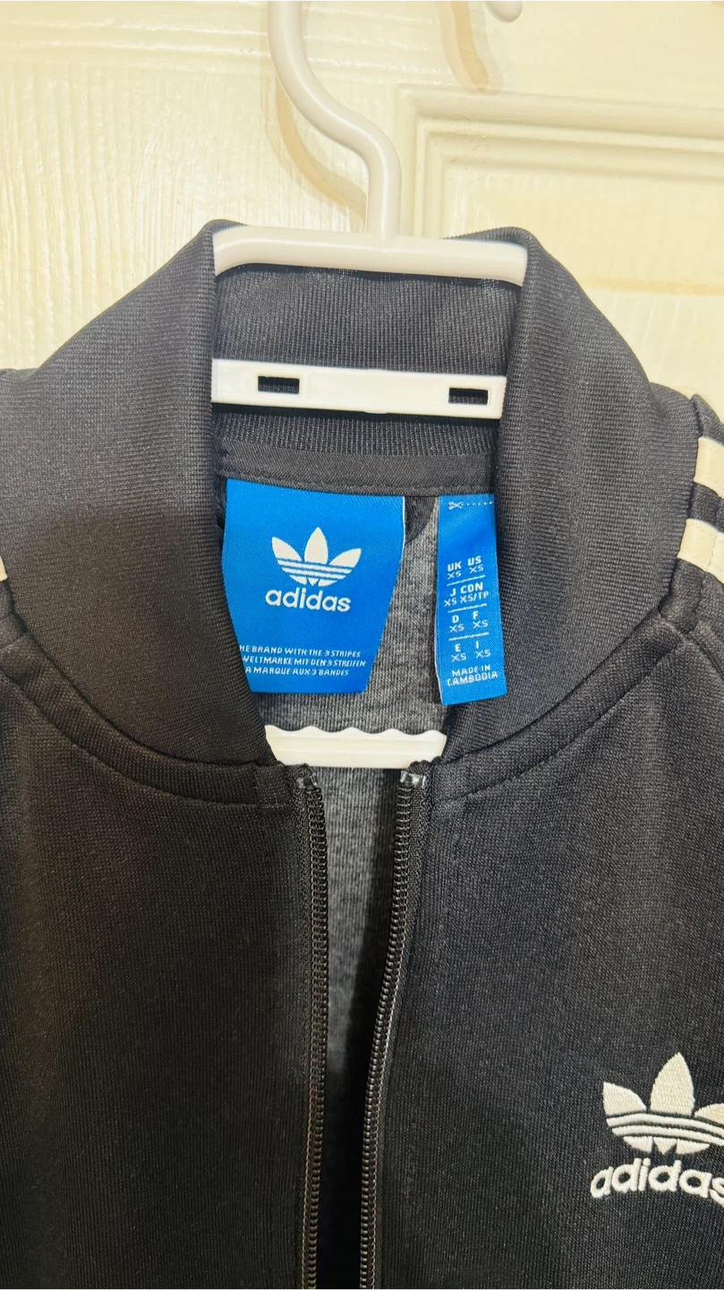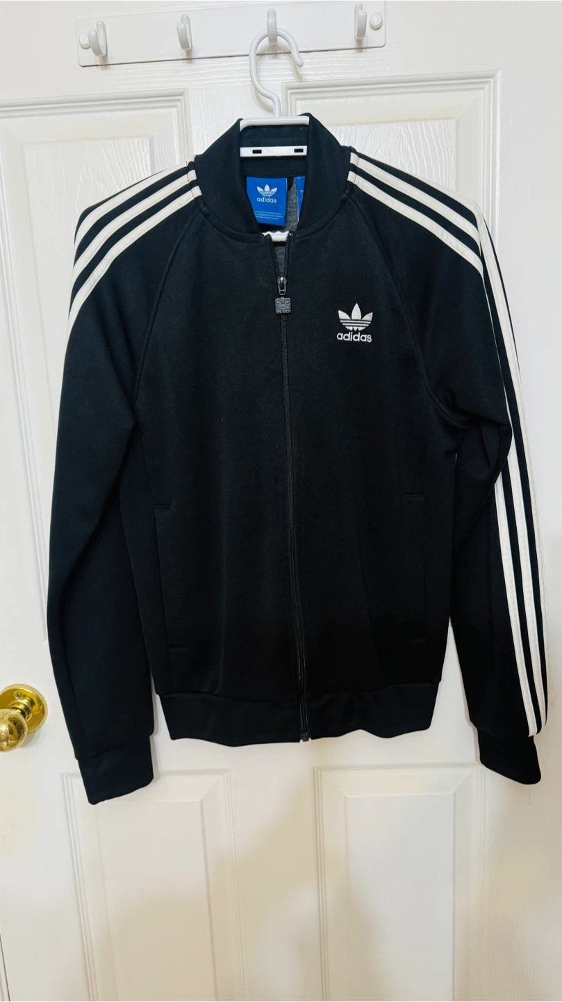 This is an Adidas track jacket in black. It features the classic three stripes on the sleeves and the Adidas trefoil logo. Size is listed as XS (UK), S (US/CA), 34 (EU/XXS).