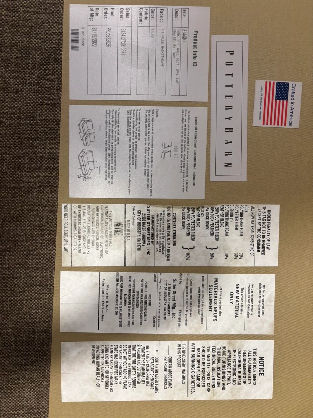 Pottery Barn chaise lounge sofa in a taupe upholstery. It's a comfortable and stylish piece for any room. Material is a blend of polyester and rayon.