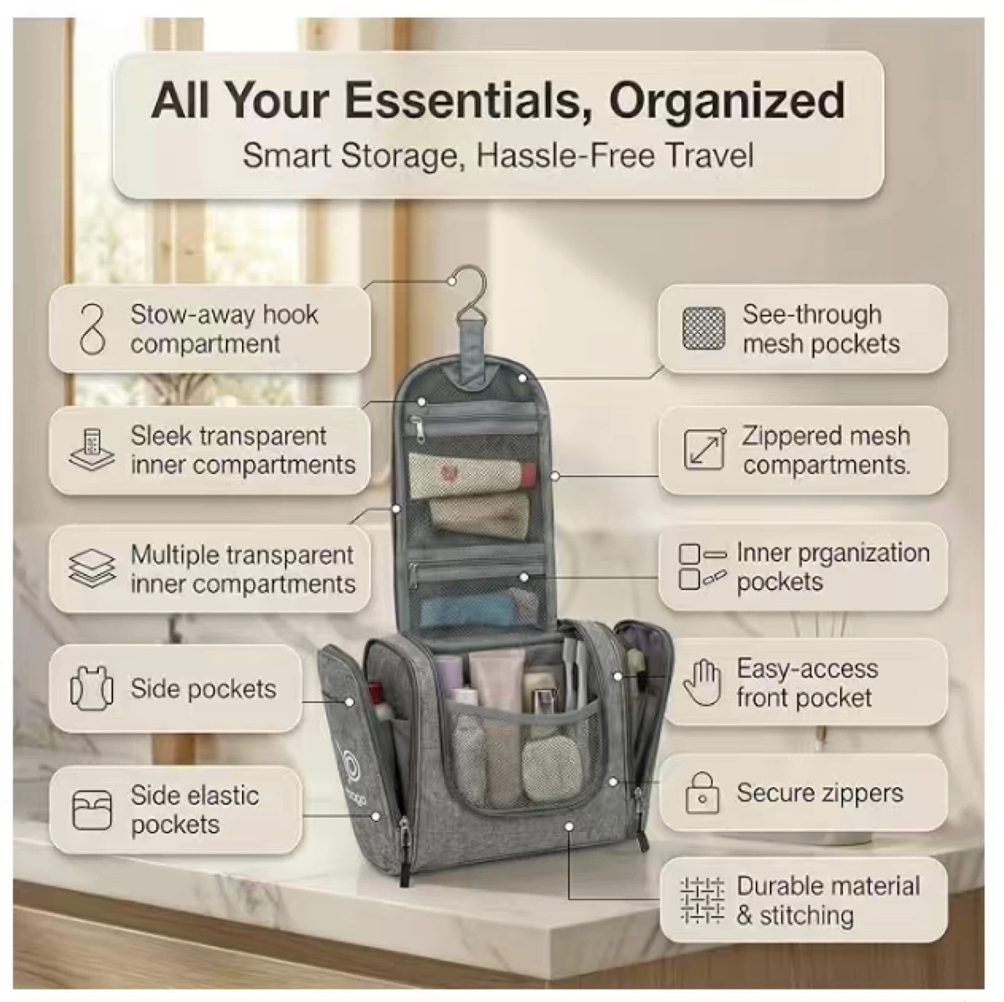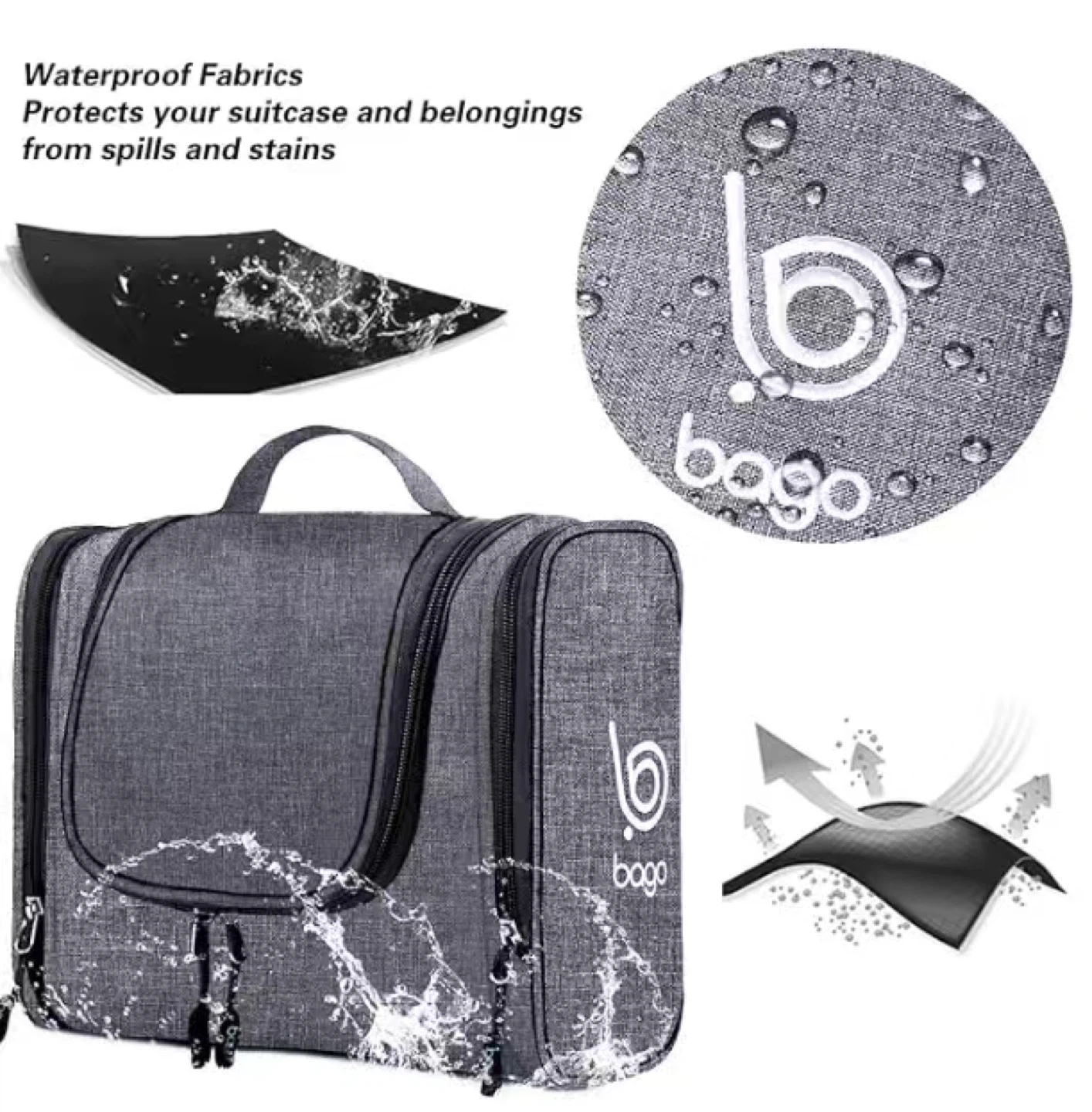 This Bago toiletry bag is grey and made of durable, waterproof fabric. It features multiple compartments including stow-away hook, see-through mesh pockets, and zippered inner compartments for organized storage. It's perfect for travel to keep your essentials protected from spills and stains.