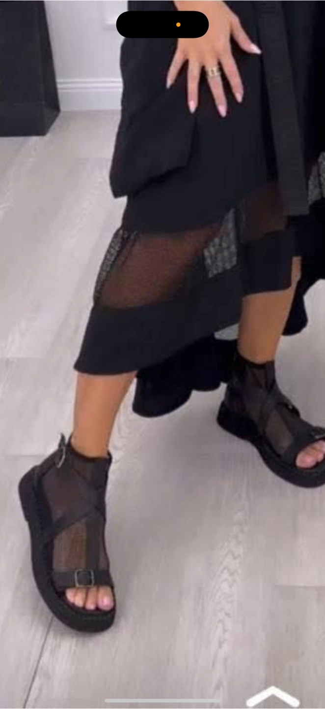 These are a pair of black mesh platform sandals. They have a chunky sole and straps across the foot. They look to be in good condition!