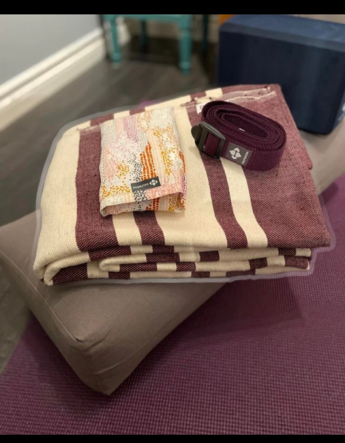 60Get ready to zen out with this Halfmoon yoga set! Includes a yoga mat, blanket, strap and lavender eye pillow, all in great condition. Barely used, in great condition. Selling due to business closure. Perfect for your home practice or taking to the studio. Time to find your inner peace!