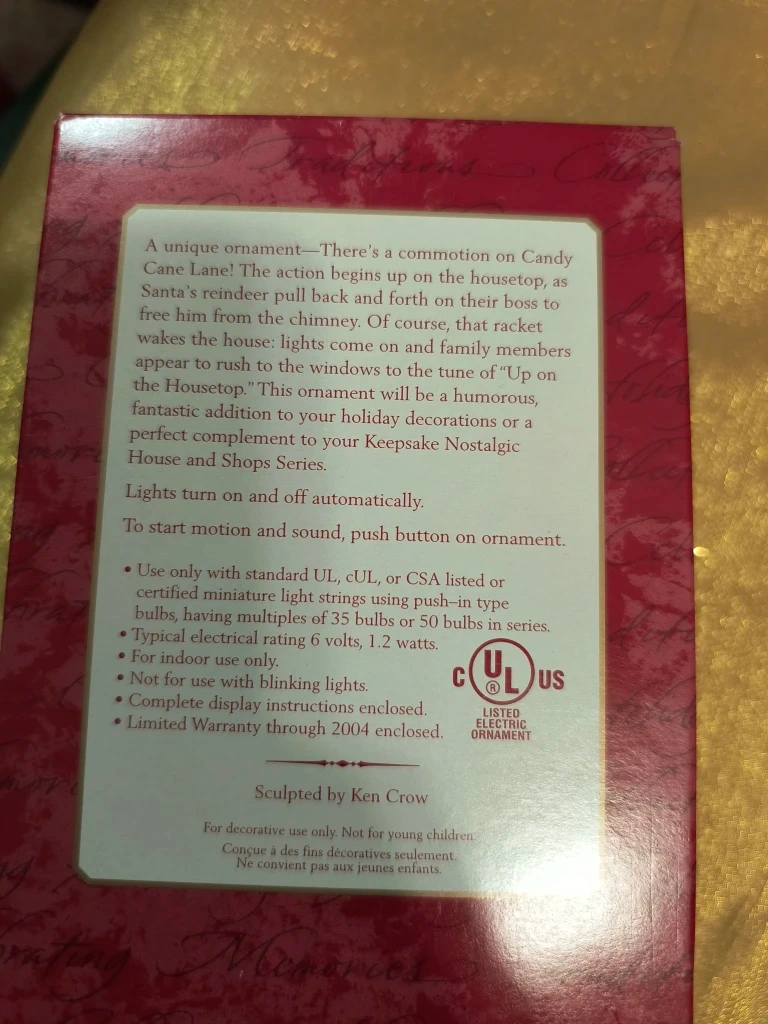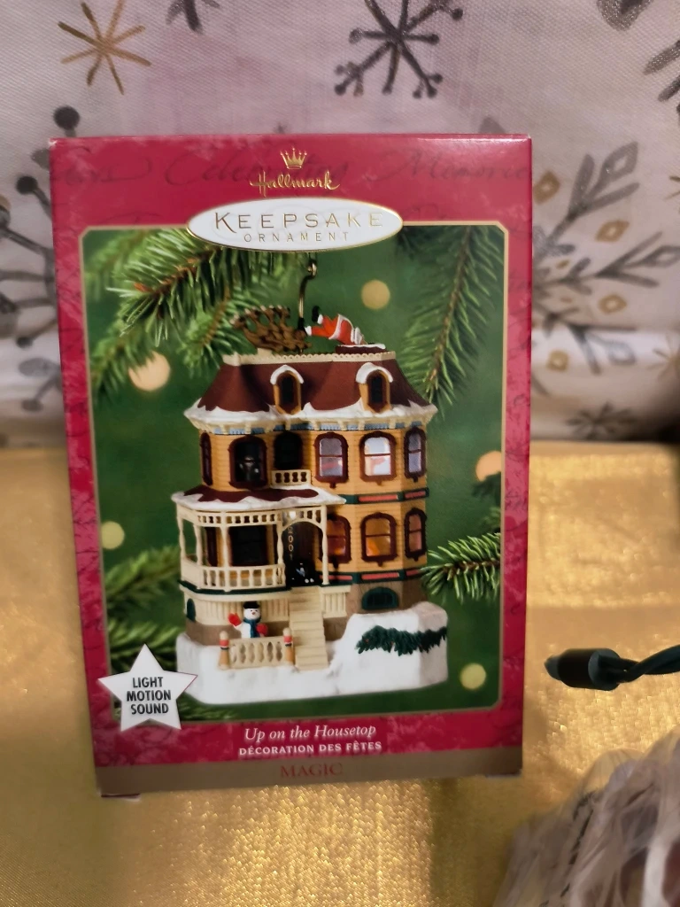 29Selling a Hallmark Keepsake Ornament, "Up on the Housetop"! It features light, motion, and sound. The ornament lights turn on and off automatically. It requires 6 volts and 1.2 watts. Comes in the original box