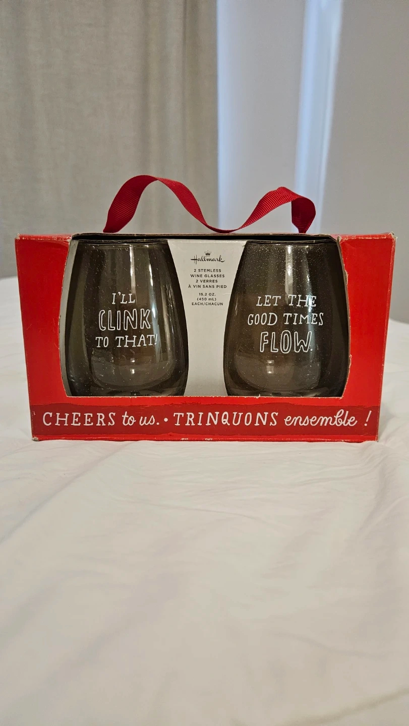 65Selling a brand new set of Hallmark stemless wine glasses! Each glass holds 15.2 oz (450 mL) and features a cute saying: "I'll clink to that!" and "Let the good times flow". Pet and smoke free home.