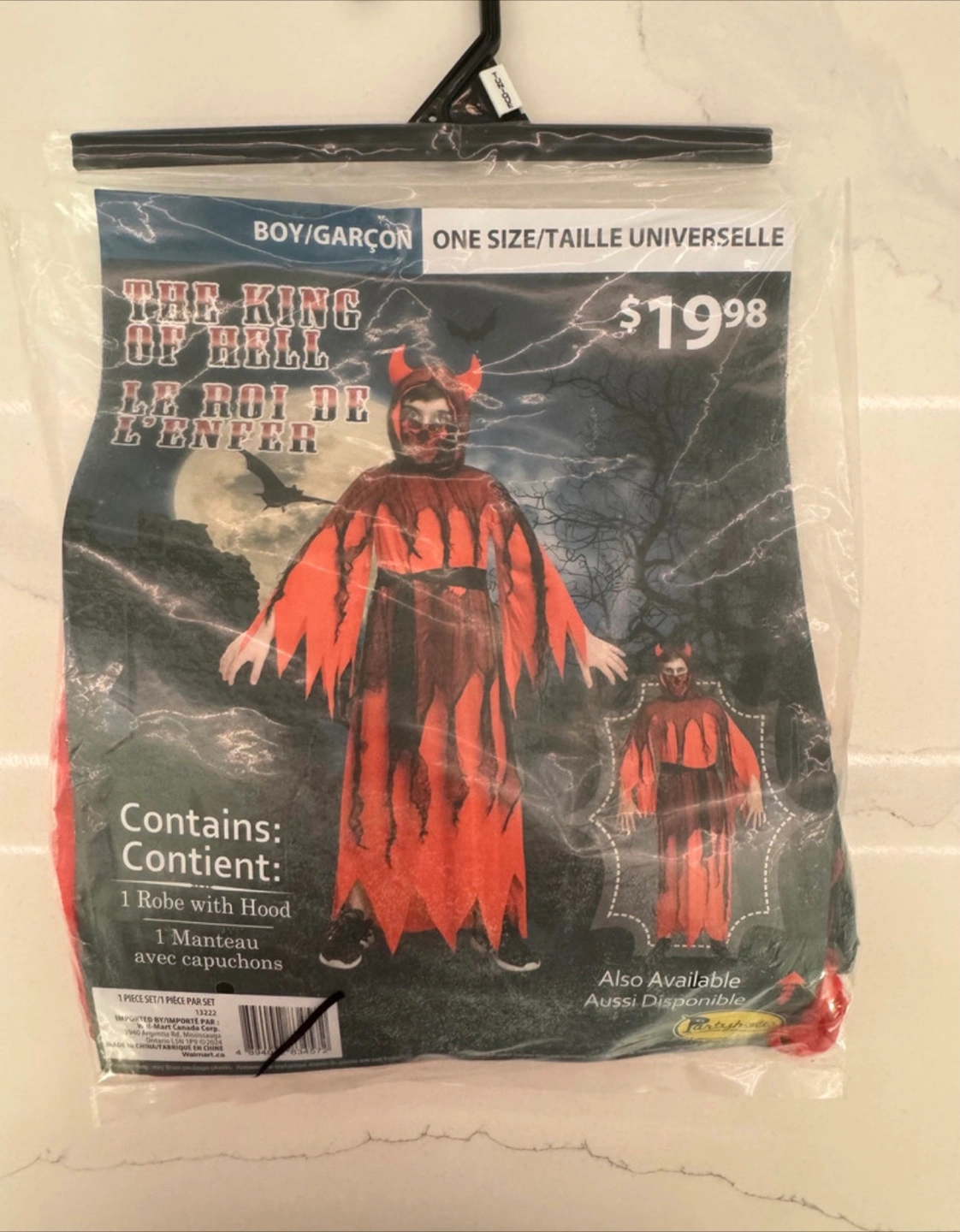HALLOWEEN COSTUME- BOYS ONE SIZE THE KING OF HELL COSTUME BRAND NEW includes: 1 robe with hood PICKUP IN COURTICE NEAR HWY 2 AND COURITCE RD all sales are final