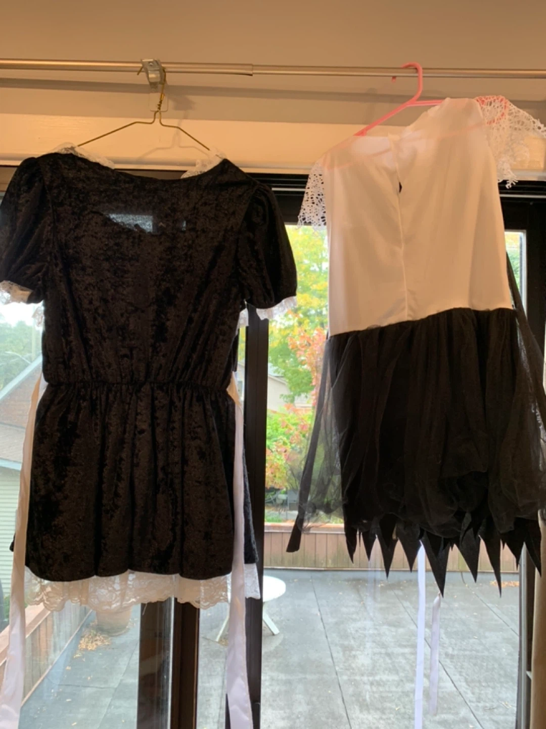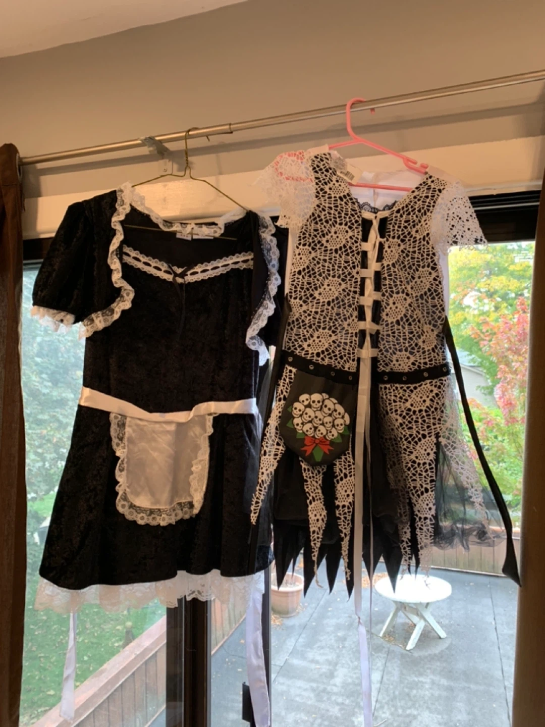 Two Halloween costumes for sale! One is a Princess Zombie, and the other is a French maid costume. Both are good condition and have only been worn once. Get ready for some spooky fun!
