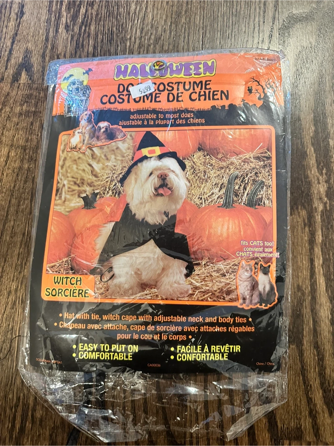 106Get your furry friend ready for Halloween with this adorable witch costume! The package includes a hat with a tie and a witch cape with adjustable neck and body ties. It's easy to put on and comfortable for your pet. Fits cats too!