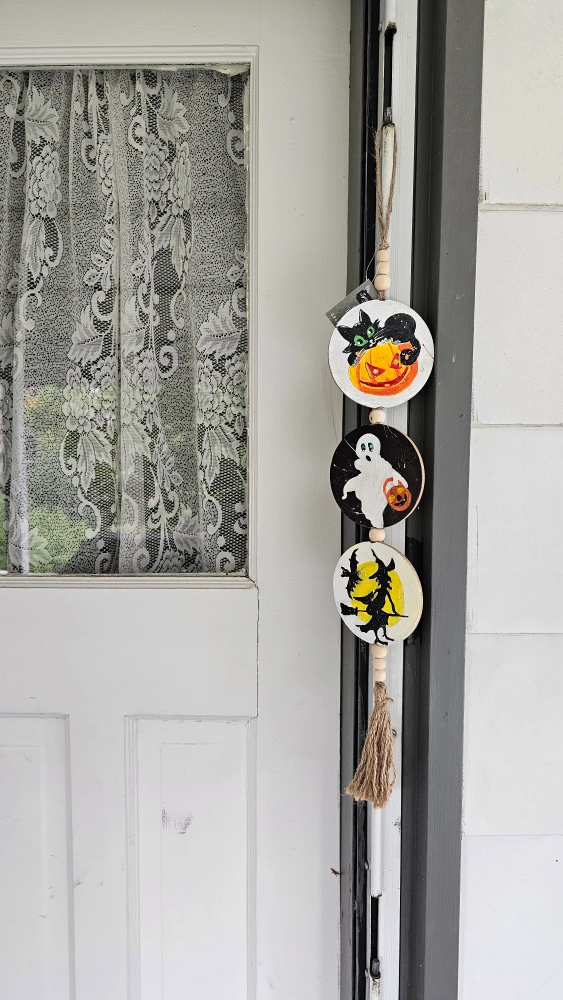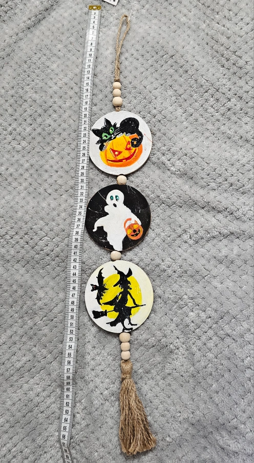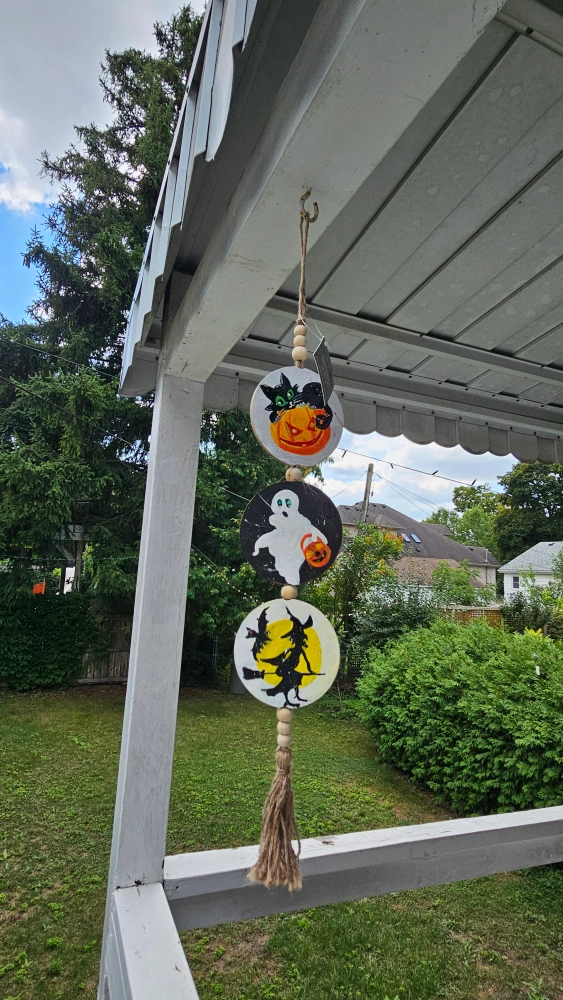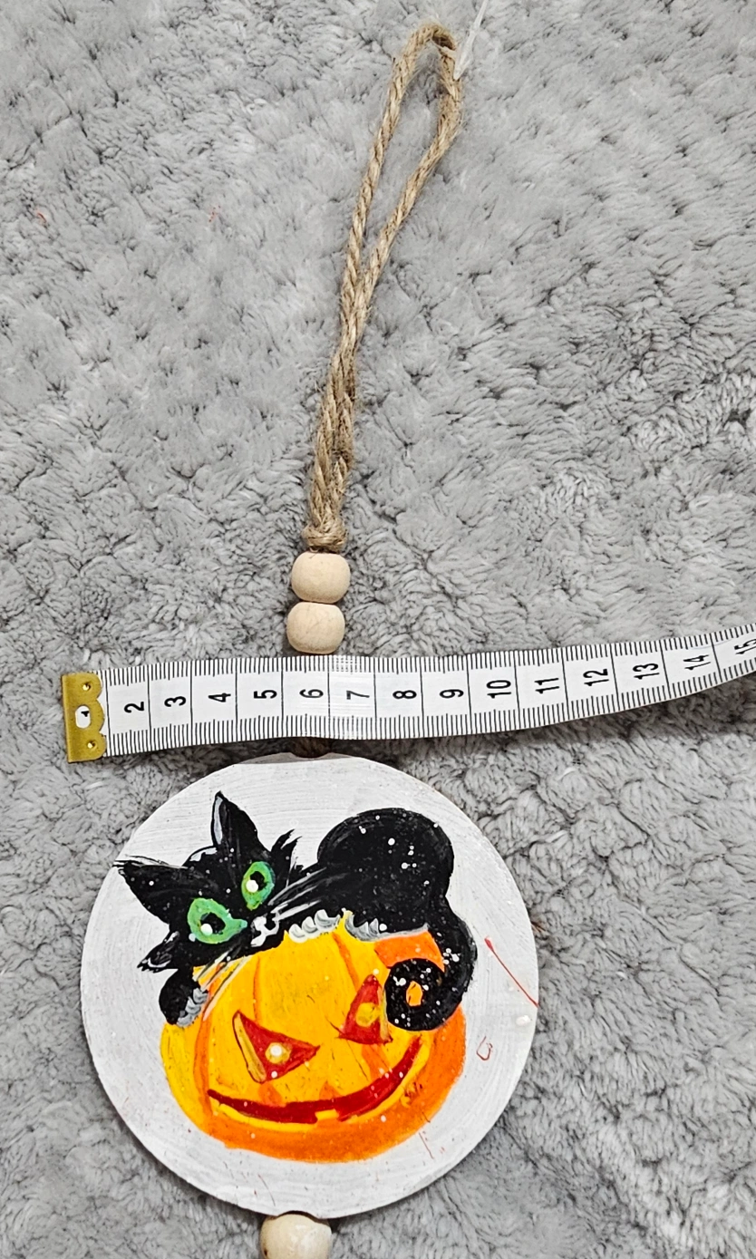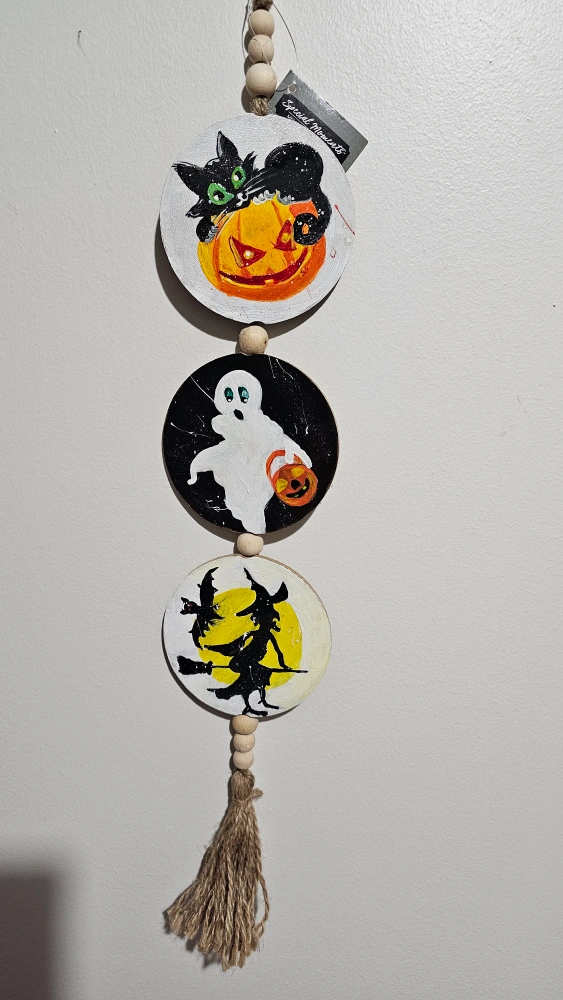Hand-painted on wood slices, painted with acrylics & sealed with protective spray