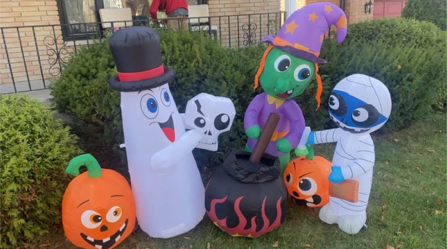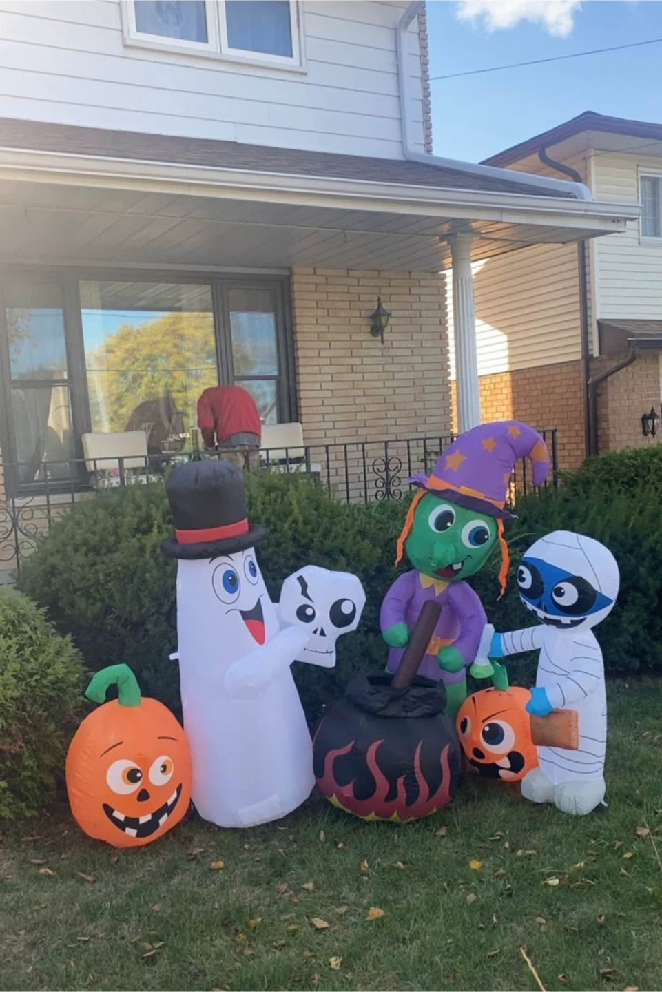 10Get ready for Halloween with this fun inflatable decoration set! It includes a ghost, witch, mummy, and two pumpkins. Perfect for adding a spooky touch to your yard this Halloween season. They light up at night