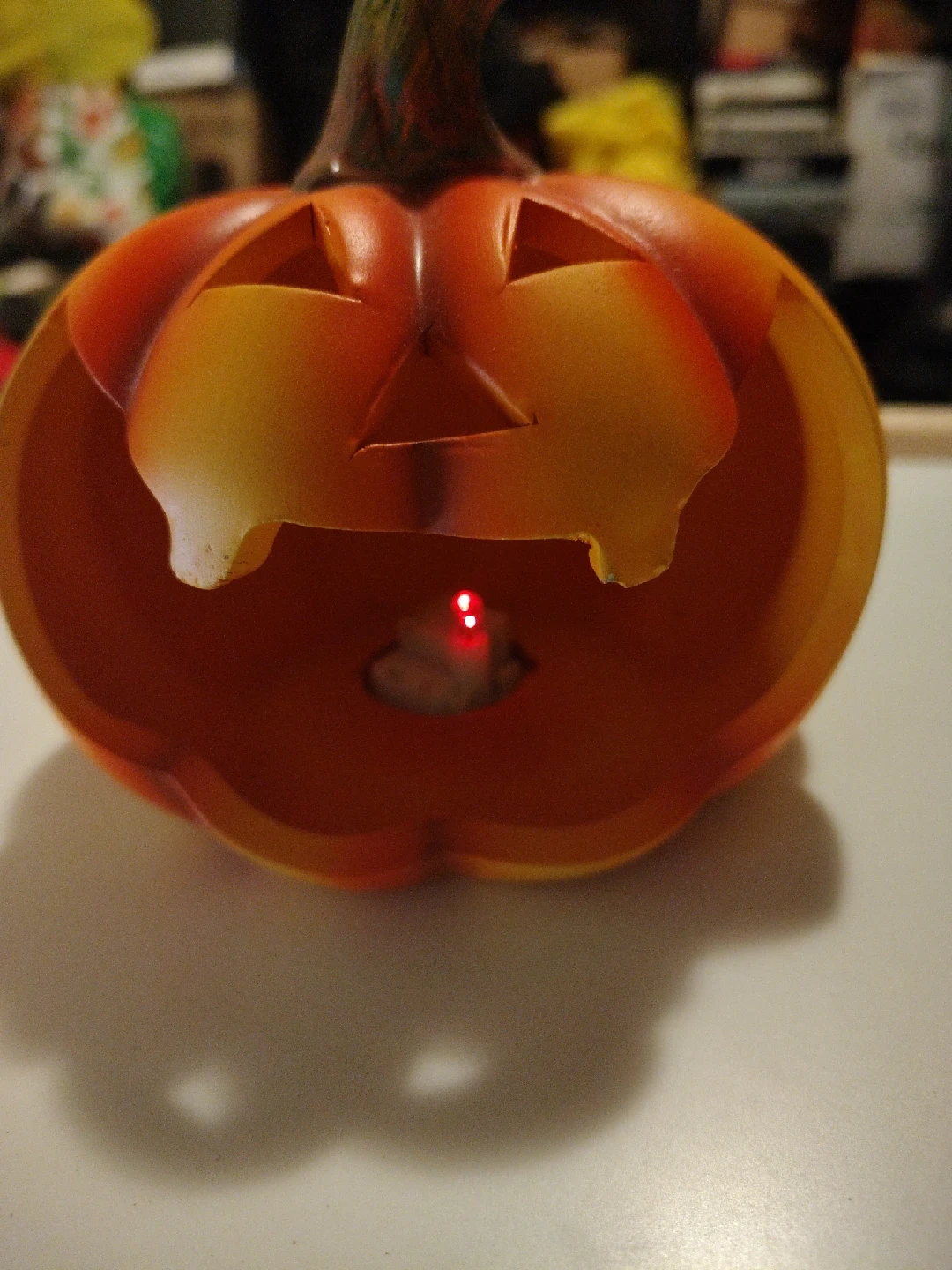 80Here's a cute little lighted pumpkin decoration for Halloween! It has a traditional jack-o-lantern face and a light inside.