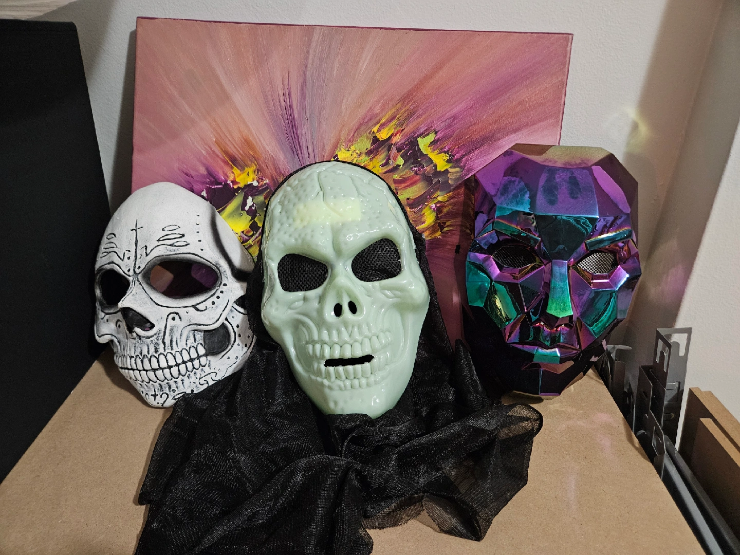 Selling a set of three Halloween masks! Included are two skull masks (one white with black details and one glow-in-the-dark) and a geometric mask with a cool iridescent finish. Perfect for Halloween or costume parties!