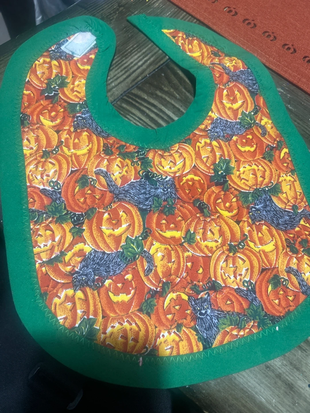 Please support Handmade by my 9yr old daughter Super cute baby bib with a Halloween theme! It features a fun print with pumpkins and black cats. Perfect for keeping your little one clean during meal times or while they're being creative