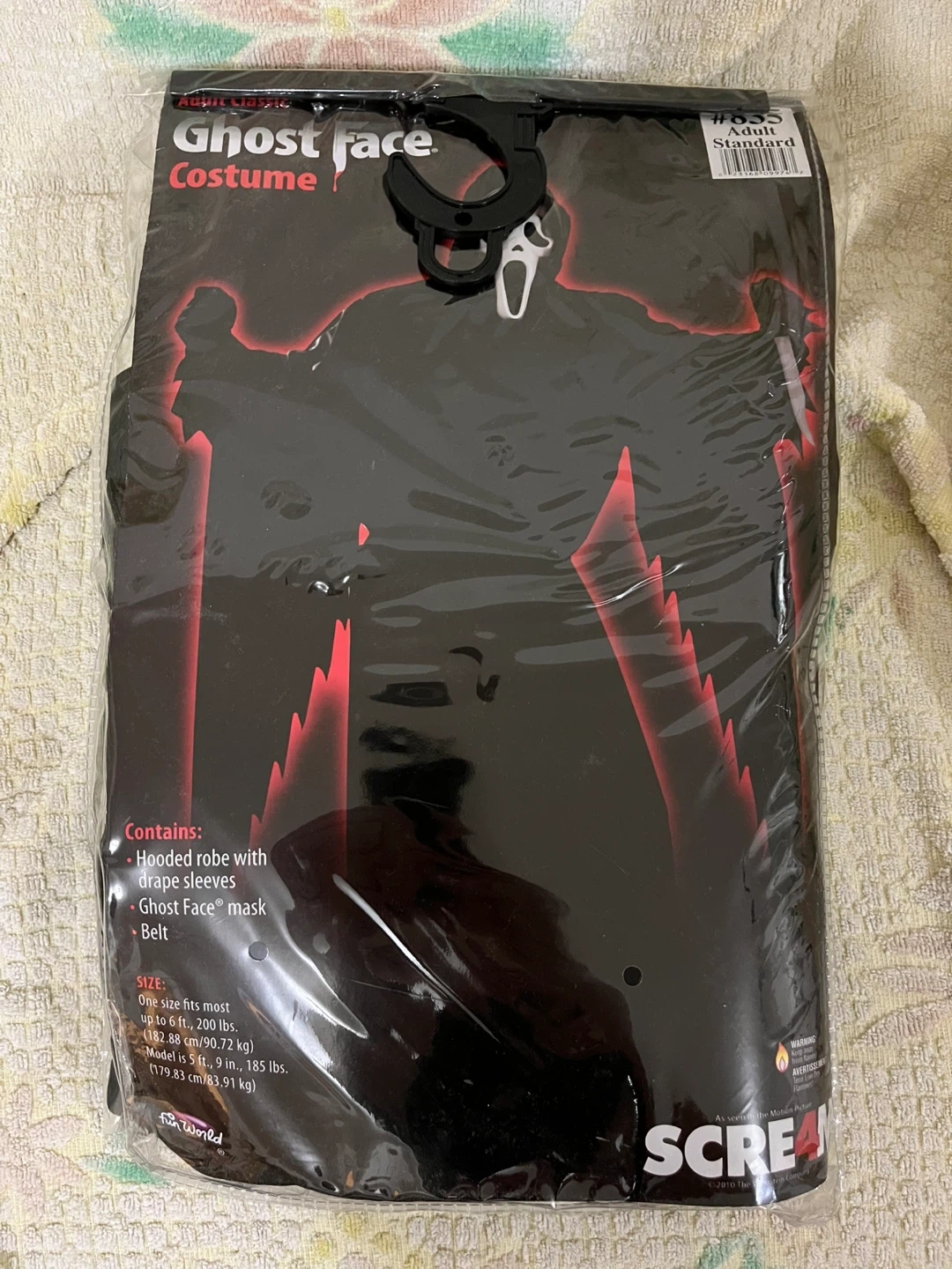 Selling a Ghost Face costume, adult standard size. It includes a hooded robe with drape sleeves, a Ghost Face mask, and a belt. The package says one size fits most up to 6 ft., 200 lbs (182.88 cm/90.72 kg).