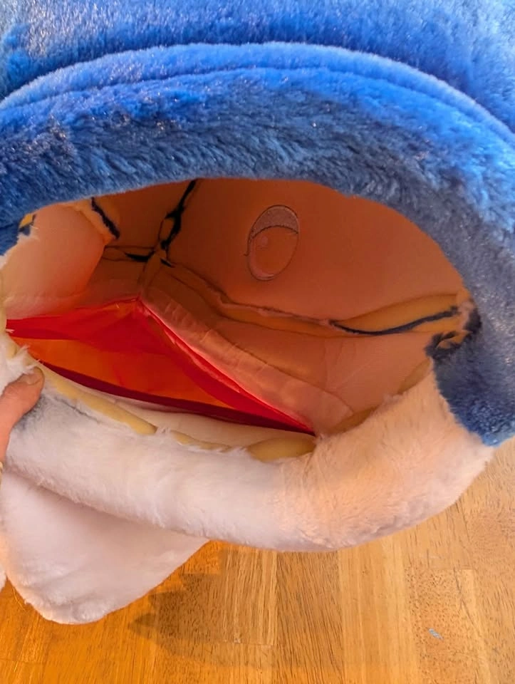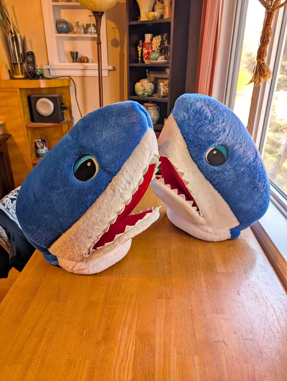 15Be a shark for Halloween!! Wearable plush shark heads, there is a mesh screen in the mouth to see out. Worn only once to a jungle themed party, clearly out of our element, so only worn for a short while. Can be worn as a hat too.