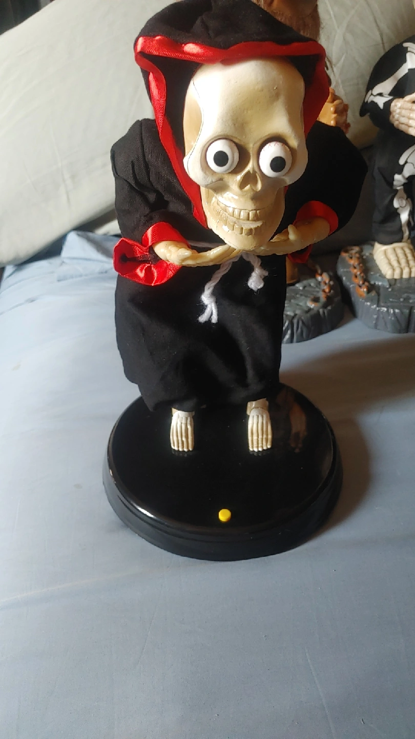 Creepy Halloween skeleton decoration with a black robe and red trim. Perfect for adding a spooky touch to your Halloween decor