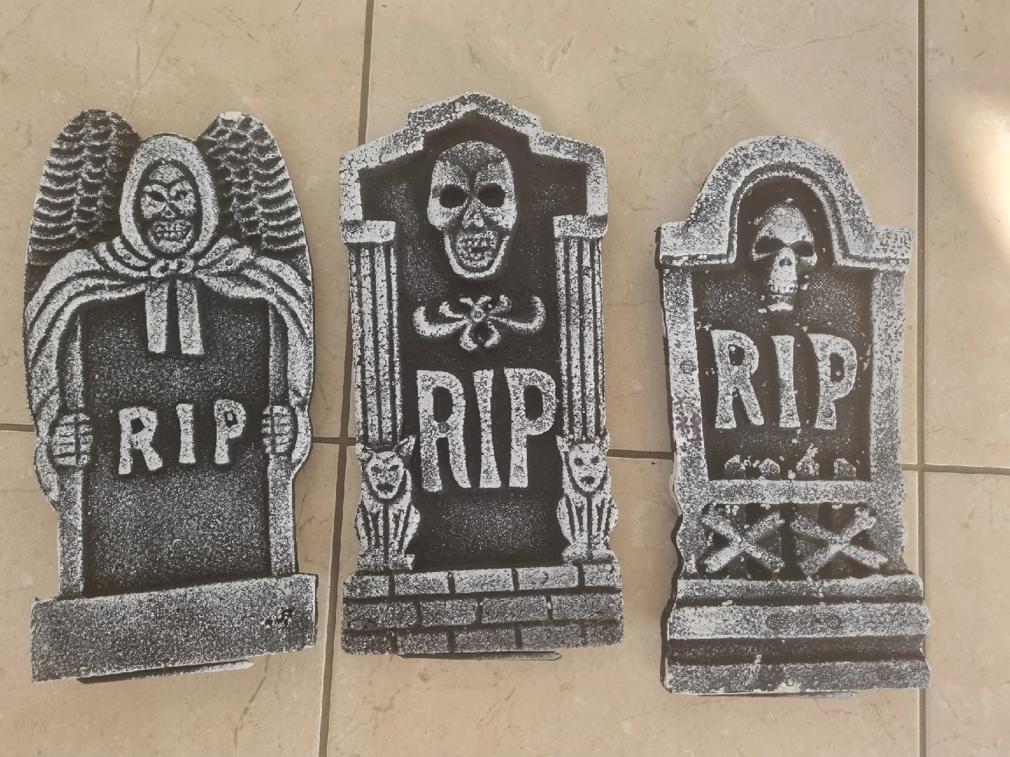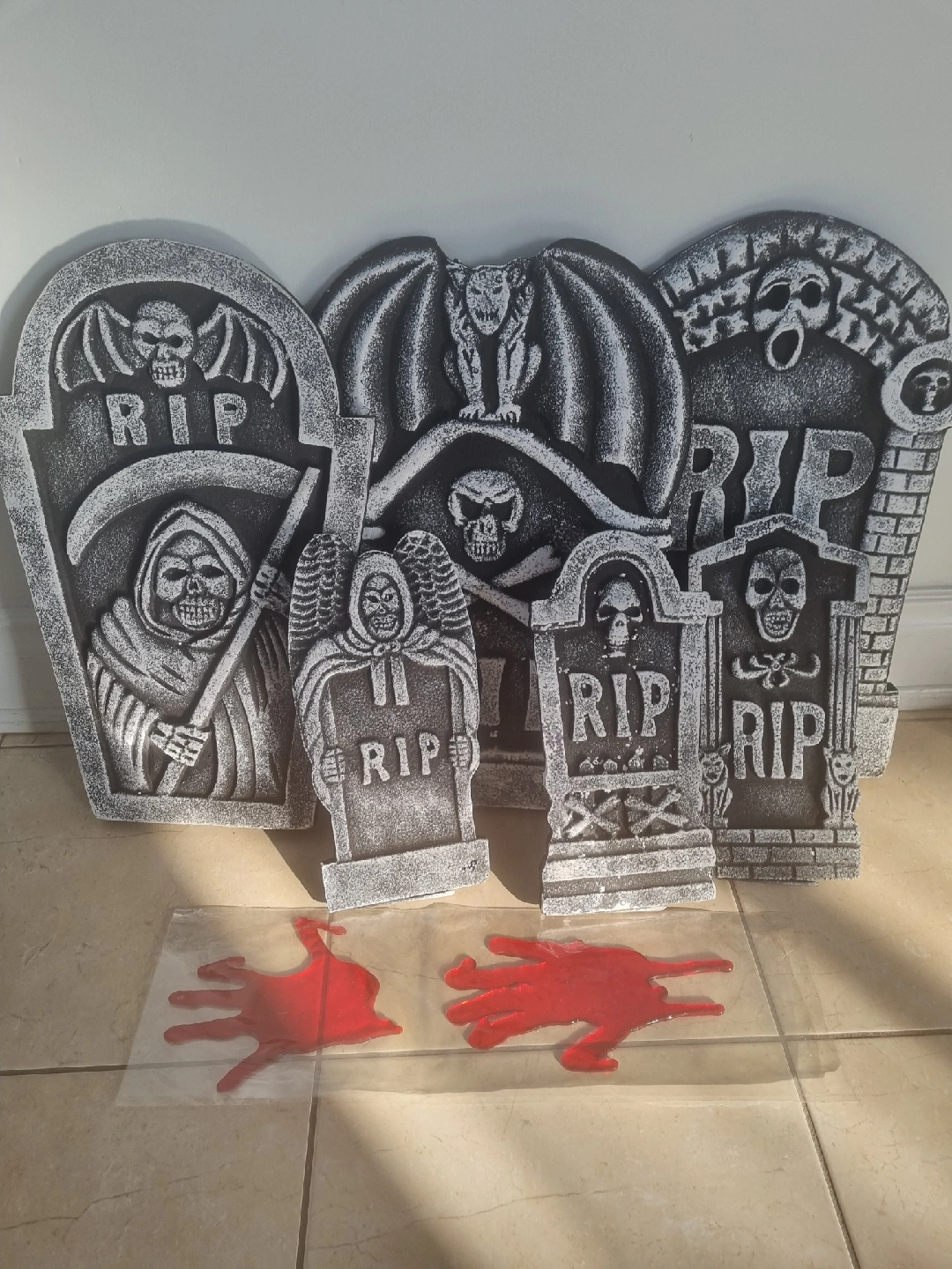 Get ready for Halloween with these spooky tombstone decorations! This set includes 7 tombstones with various designs, perfect for creating a graveyard scene in your yard or home. They're in great condition and ready to add some fright to your Halloween festivities