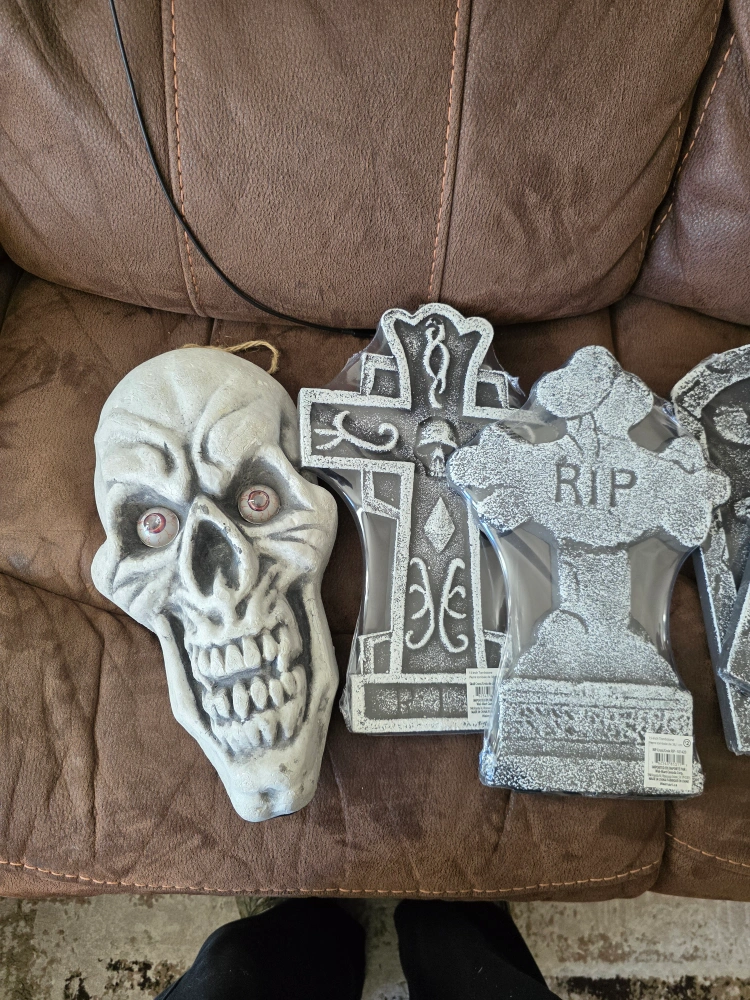 113I have some Halloween decorations up for grabs! There are tombstone and skull decorations that are sure to add some spooky fun to your Halloween display