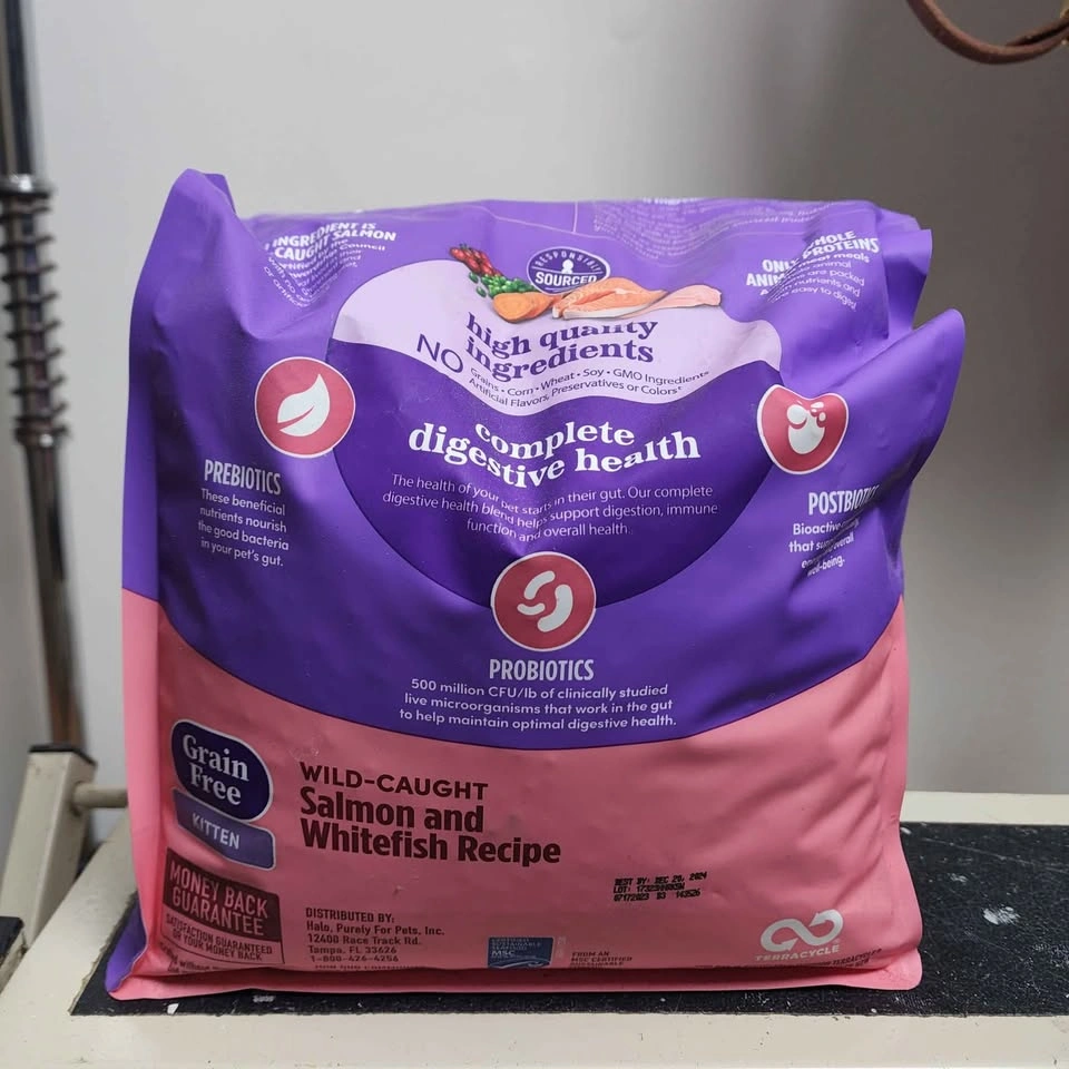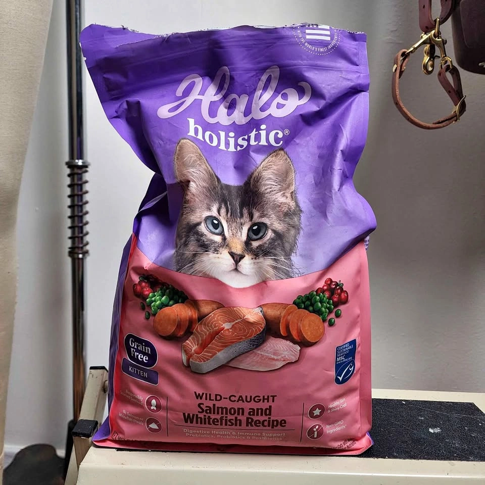 84Opened but barely eaten. 6lb bag of Halo Salmon Whitefish kibble. My hedgehog loved this - she died. Key Benefits: Holistic Cat Food Made with Real, Whole Protein: One 6-lb dry kitten food bag of Halo Holistic Wild-caught Salmon and Whitefish Recipe made with whole salmon as the first ingredient - and no meat meals of any kind Guaranteed DHA to support brain development in kittens and optimal balance of omega fatty acids for a healthy skin and radiant coat Natural Dry Cat Food with Added Vitamins and Minerals: Cooked in the USA with high-quality ingredients for optimal nutrition and complete digestive support Complete Digestive Health: Prebiotics, probiotics and postbiotics deliver digestive care plus immune support Responsibly sourced: Made with MSC (Marine Stewardship Council) certified wild-caught fish that lived in their natural environment and consumed a diversediet with no antibiotics, plus non-GMO ingredients, and no unnecessary ingredients like corn, wheat or soy. Lowball offers ignored, check my other listings. Purging lots! Pick up by Queensway and Windermere Cash only, no drop off or delivery.