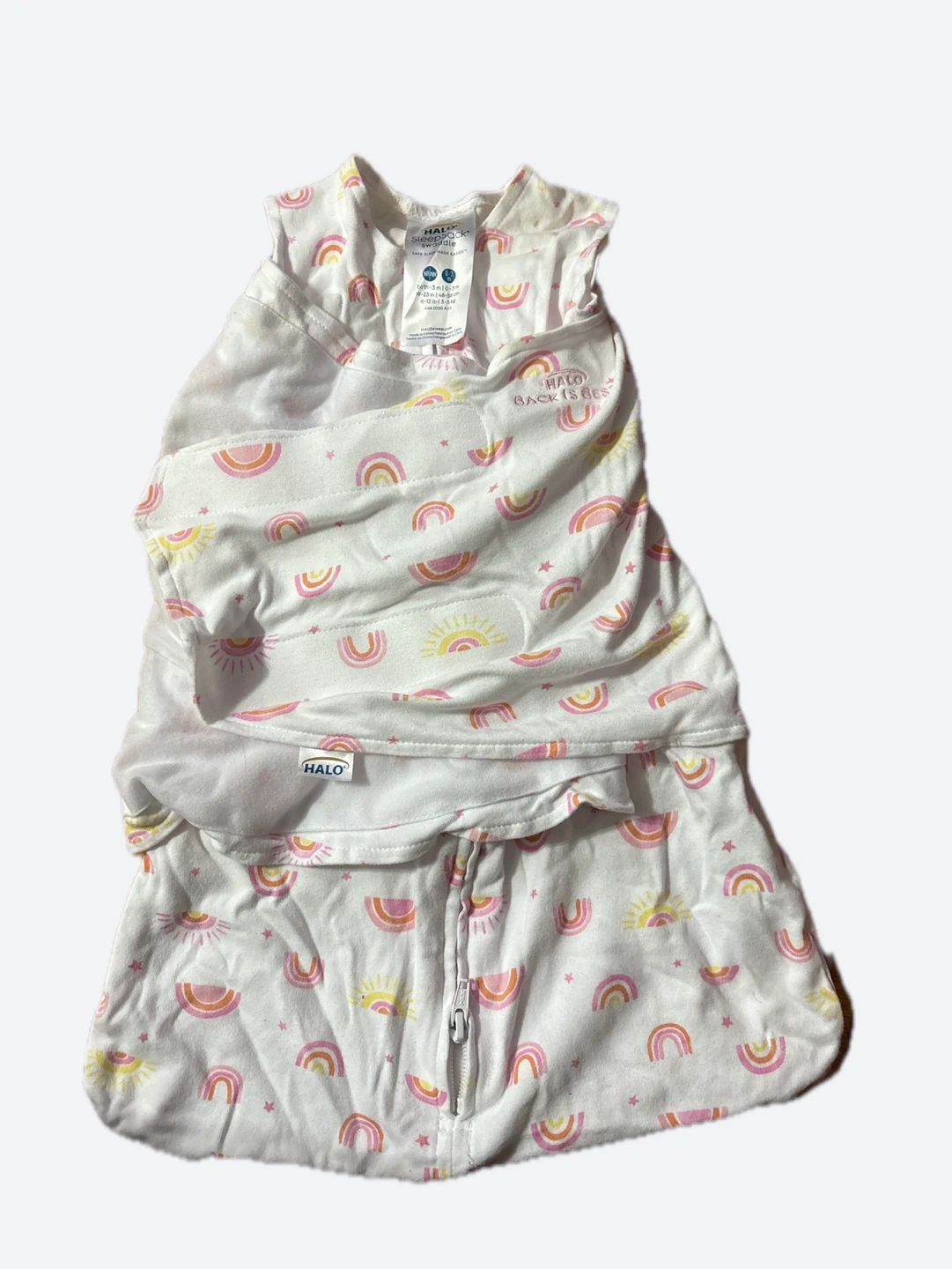 Halo Sleepsack Swaddle in a size for 0-3 month olds! Features a cute rainbow and sun pattern on a white background. It's in great condition and ready for a new little one!