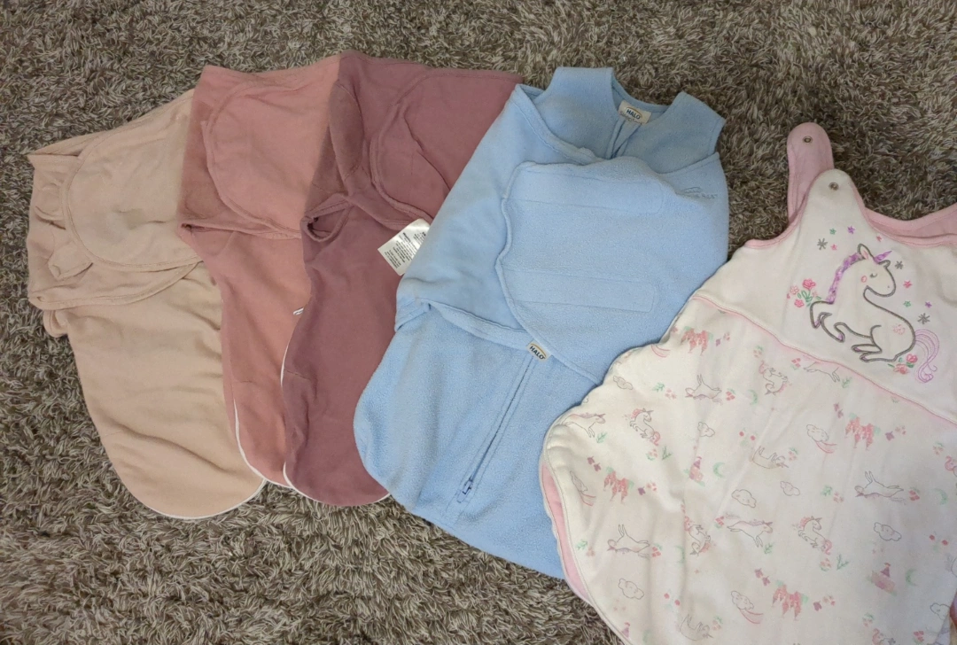 3930_3 month Bundle of five HALO and other SleepSack swaddles. Includes one blue fleece swaddle, three other colours, and one unicorn print. All items from a smoke-free pet-free shoes-free home. Everything is clean and freshly washed Pickup in Midtown
