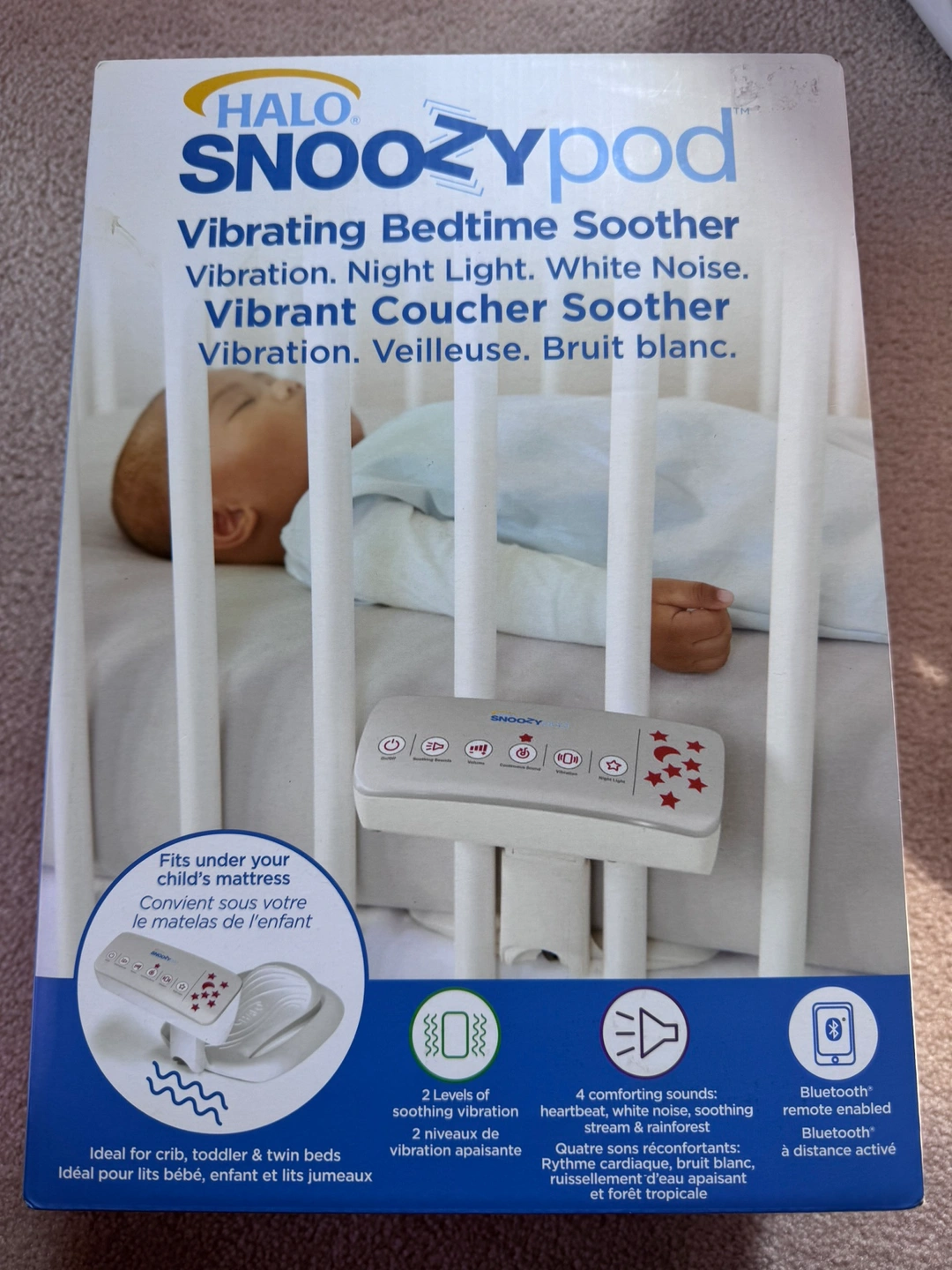 This is a Halo Snoozypod vibrating bedtime soother. It is a white noise machine with a night light, vibration and four calming sounds. It can be used for cribs, toddlers, and twin beds. It is Bluetooth enabled. Brand new.