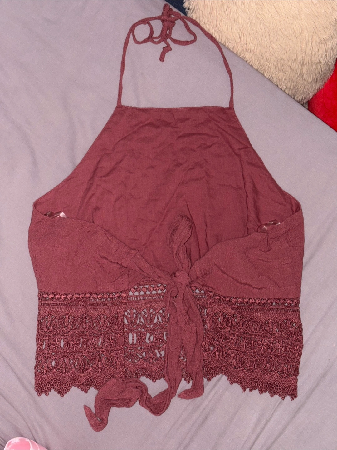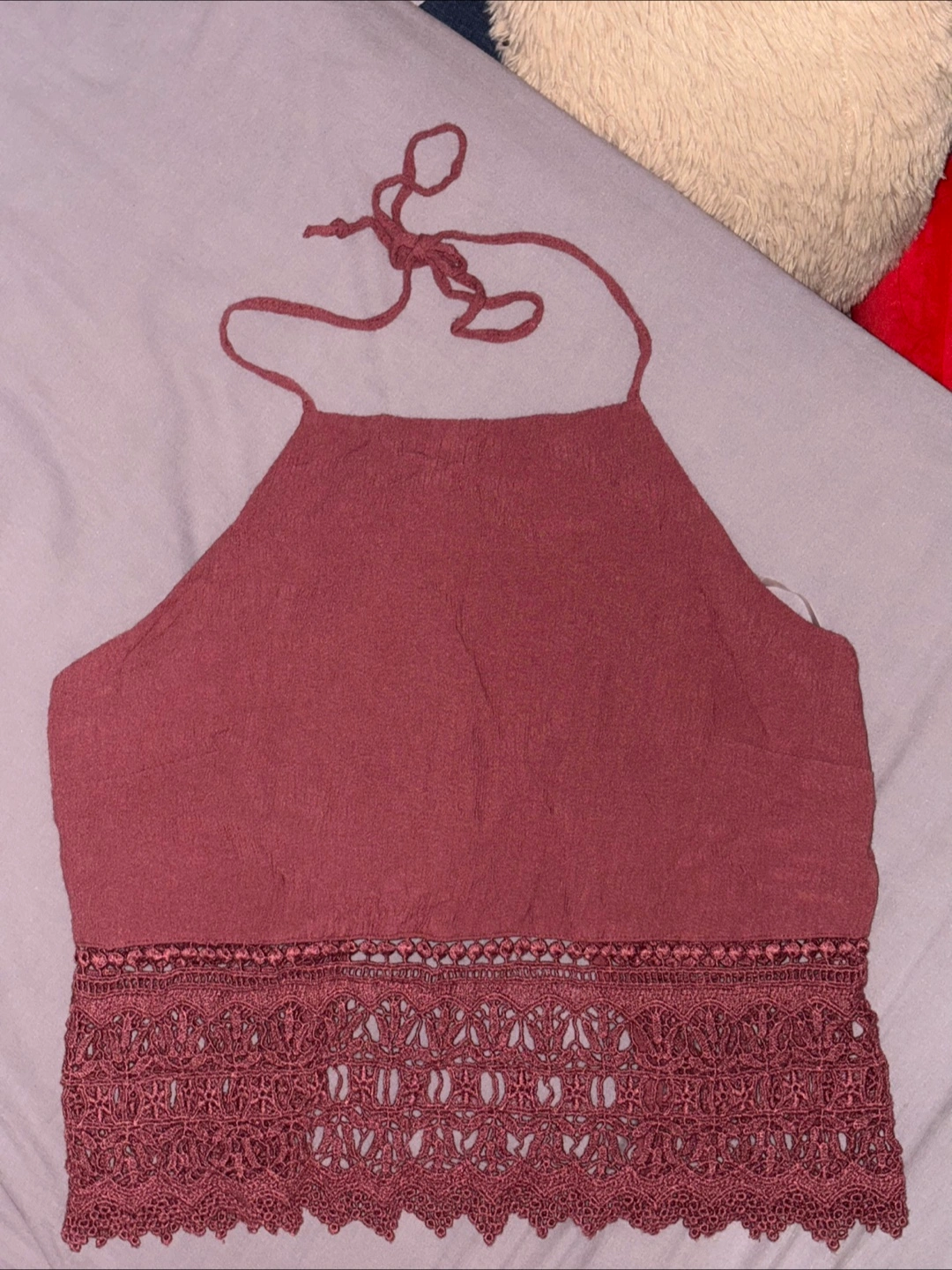 Adorable mauve halter top for sale! Tagged as a medium but also fits a small. Features delicate lace trim at the hem—perfect for a stylish summer look!