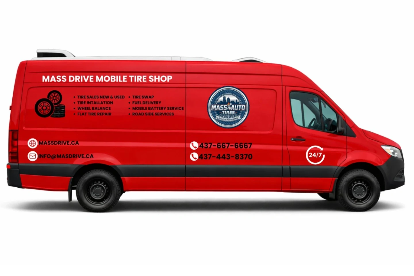 Mobile tire shop service offering tire sales, installation, swaps, fuel delivery, battery service, and road side assistance. Available 24/7. Contact Mass Drive for assistance.