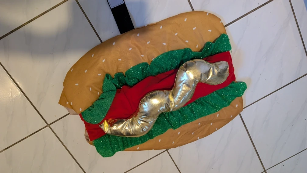 608Snag this adorable hamburger hotdog costume for your furry friend! It's in great condition and measures about 22 inches long. Perfect for Halloween or just a fun dress-up day! Pickup only St Clair East and O'Connor