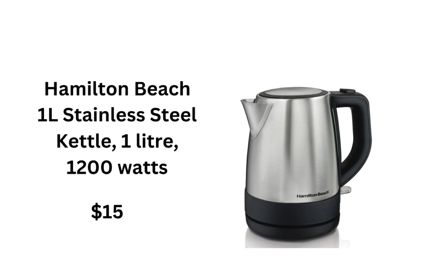 Stainless steel kettle. 1 litre capacity. 1200 watts. Good condition.