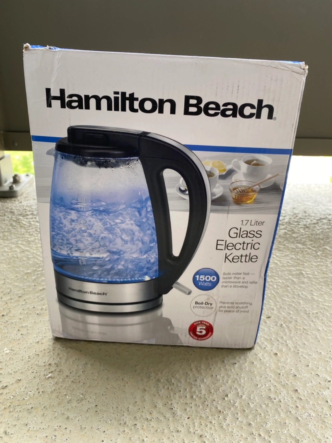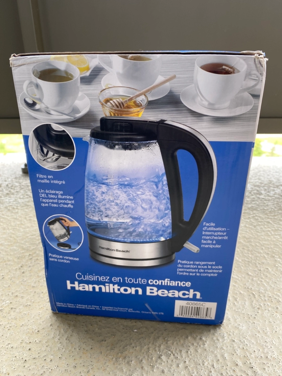 Original price - 50$ at Walmart and other locations 1.7 Litre: Large enough for all your kitchen needs. 1500 watts: Powerful for rapid boiling Concealed heating element eliminates lime, corrosion, scale & other mineral buildup. Pull up lid design to easily add water Auto shut-off. Boil dry protection Blue LED lights illuminate kettle when in use The modern soft blue illumination in the glass kettle is compact, space-saving and looks great on the kitchen counter. Serving at the table is no problem as the kettle lifts right off the 360-degree rotating base without the cord. The powerful rapid-boil system provides fast heating from any standard outlet and the auto shut-off function helps keep the kettle from boiling dry. This 1.7 Litre Glass Kettle features push-button lid and easy-pour spout that make filling and serving easy. A cord wrap is under the base for space-saving storage when not in use.