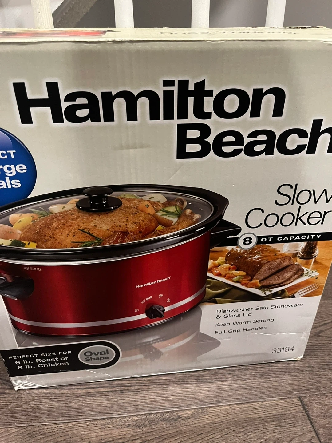 Selling a Hamilton Beach slow cooker with an 8 QT capacity. It's perfect for a 6 lb roast or 8 lb chicken. The stoneware and glass lid are dishwasher safe, and it has a keep warm setting. It also has full-grip handles