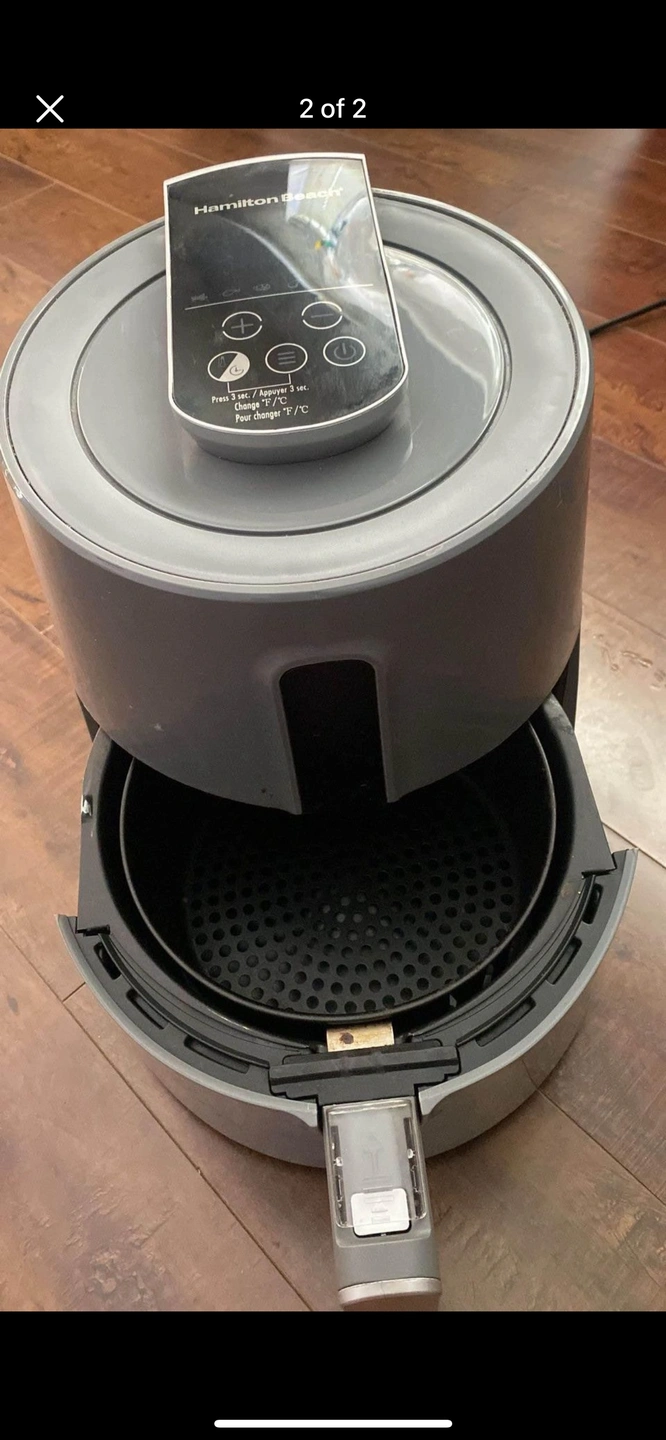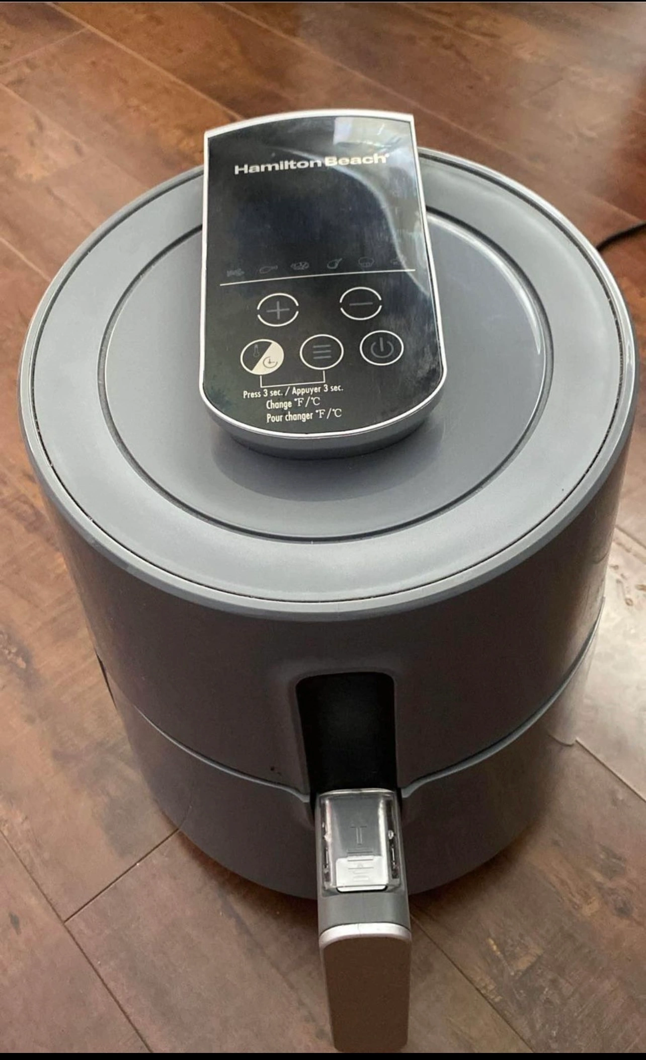 This is a Hamilton Beach air fryer. It is grey and has a digital display. It includes a basket, a removable drip tray