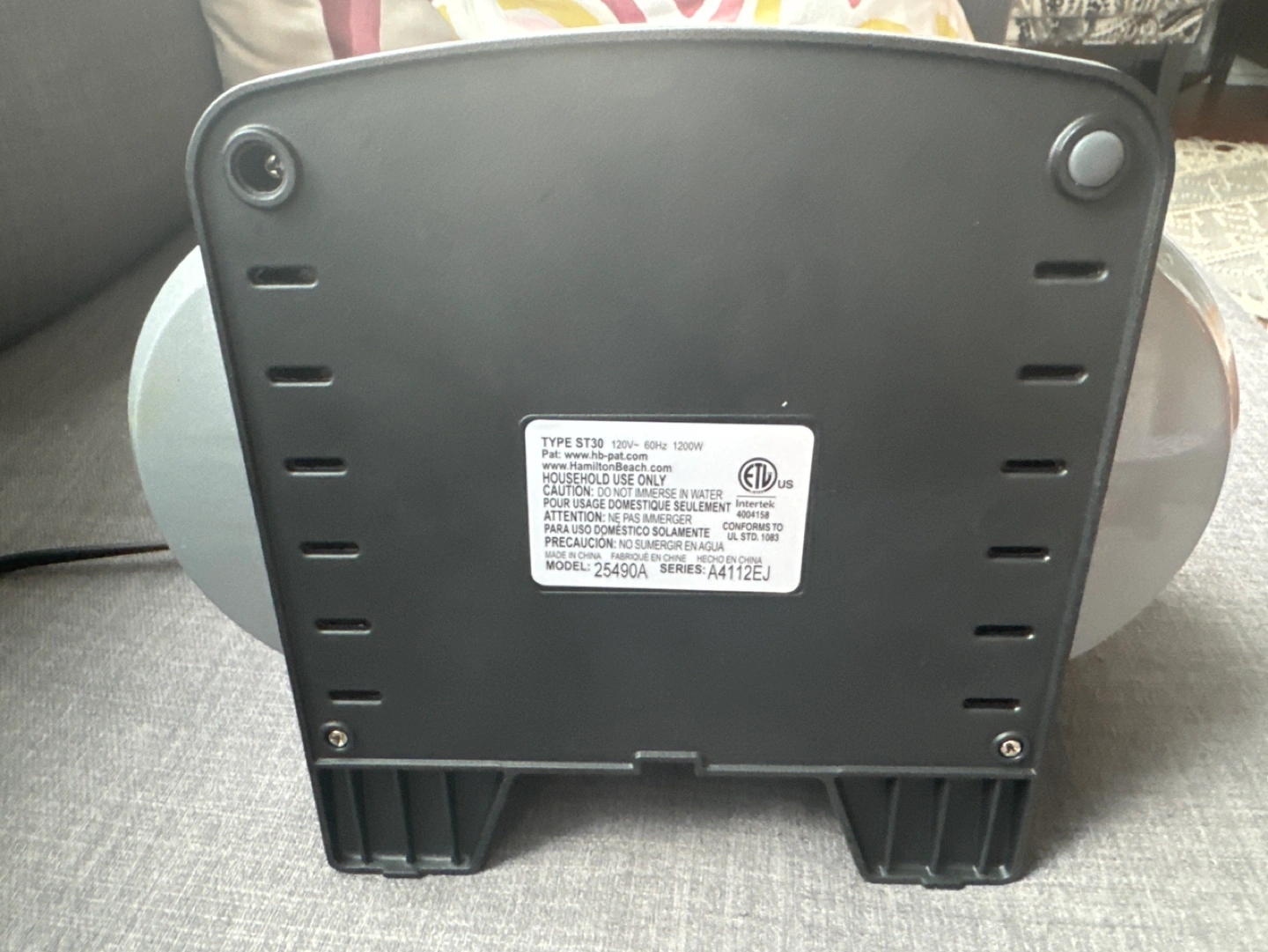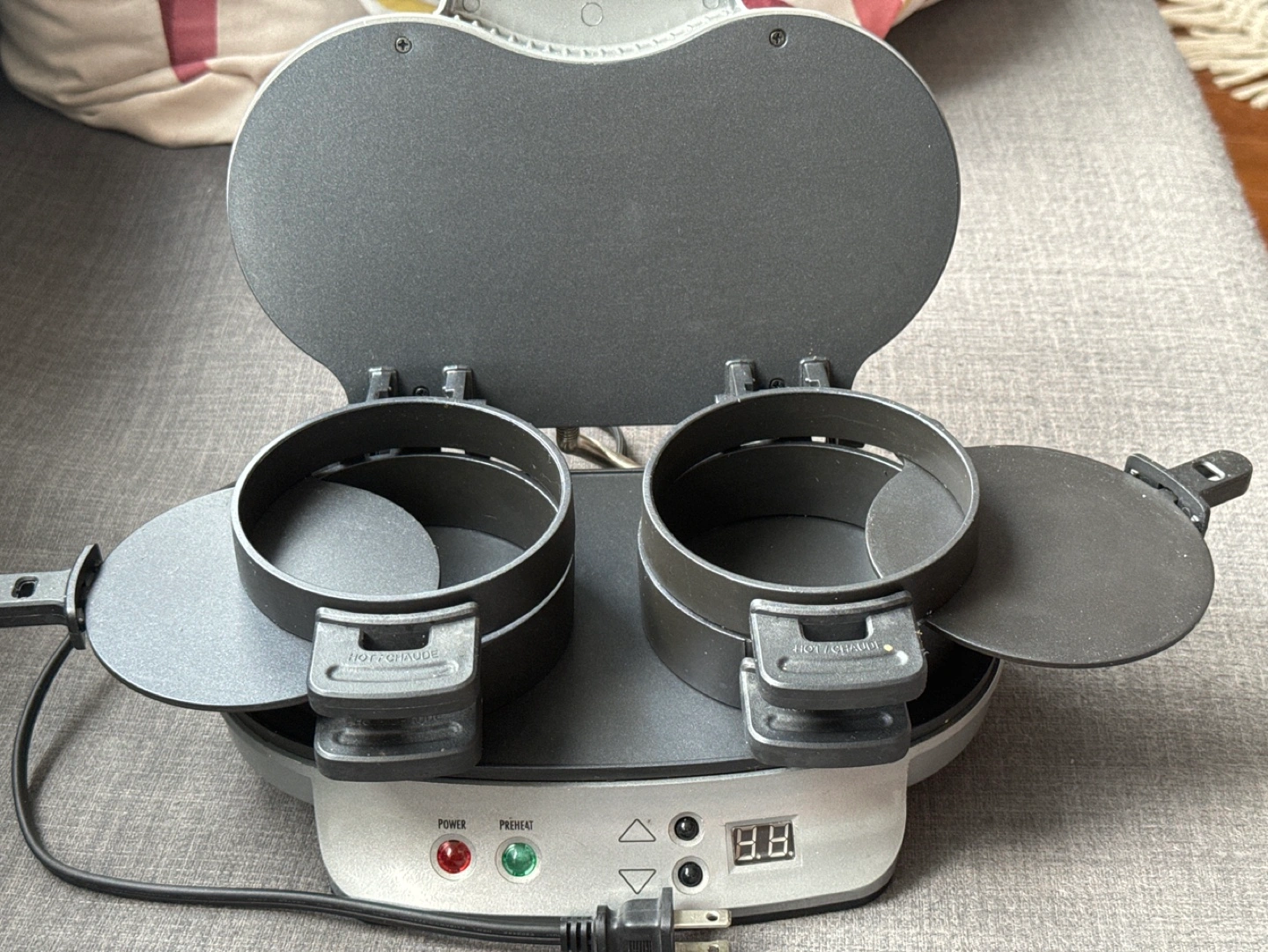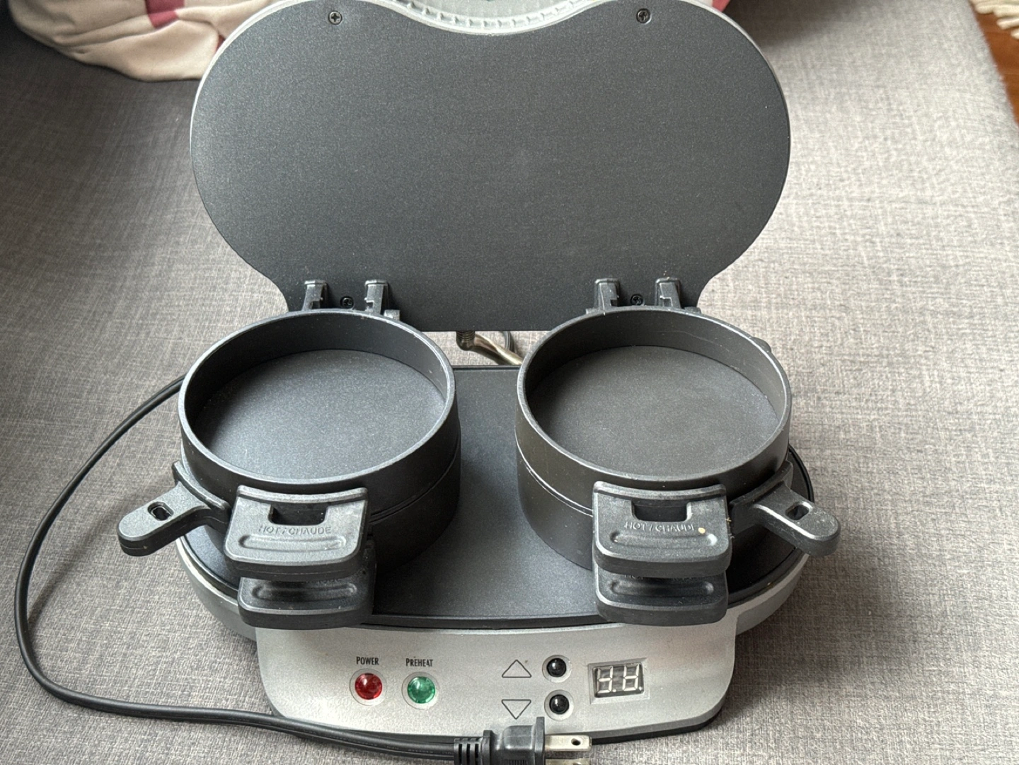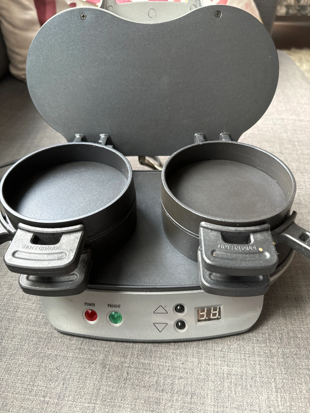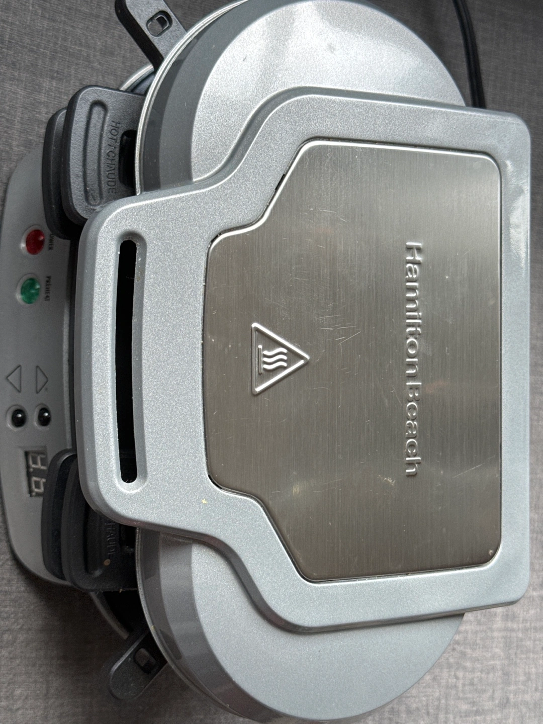 46Electric sandwich maker. Makes two sandwiches simultaneously. Features two cooking surfaces, nonstick plates, timer, and temperature control. Excellent condition.