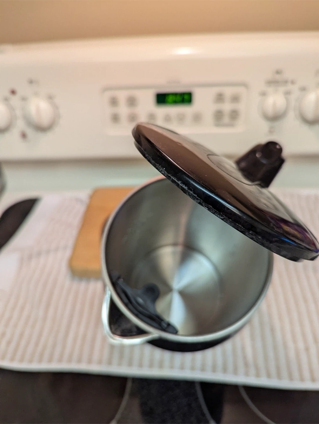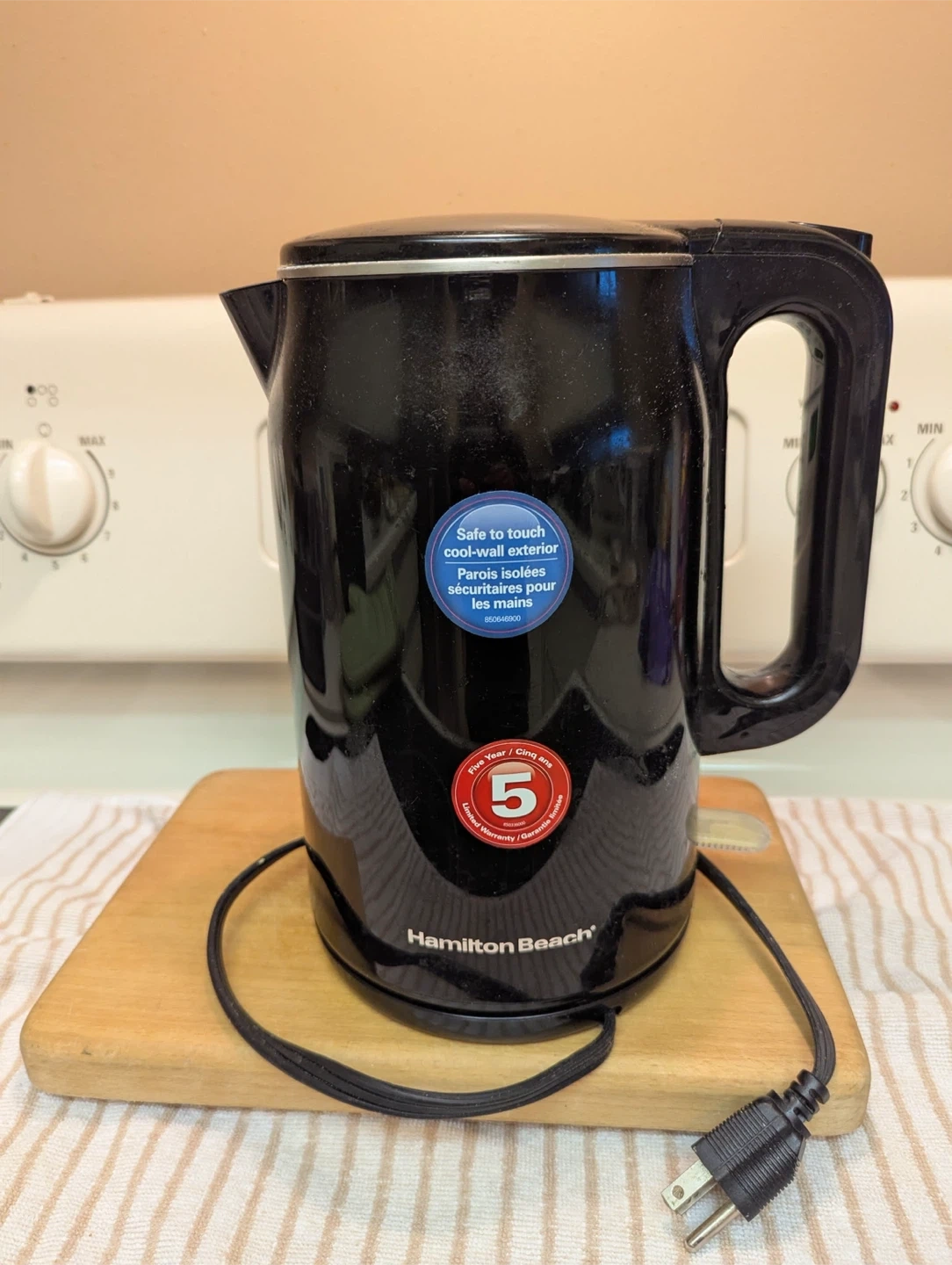 142Selling a Hamilton Beach electric kettle in black. It has a safe-to-touch, cool-wall exterior.