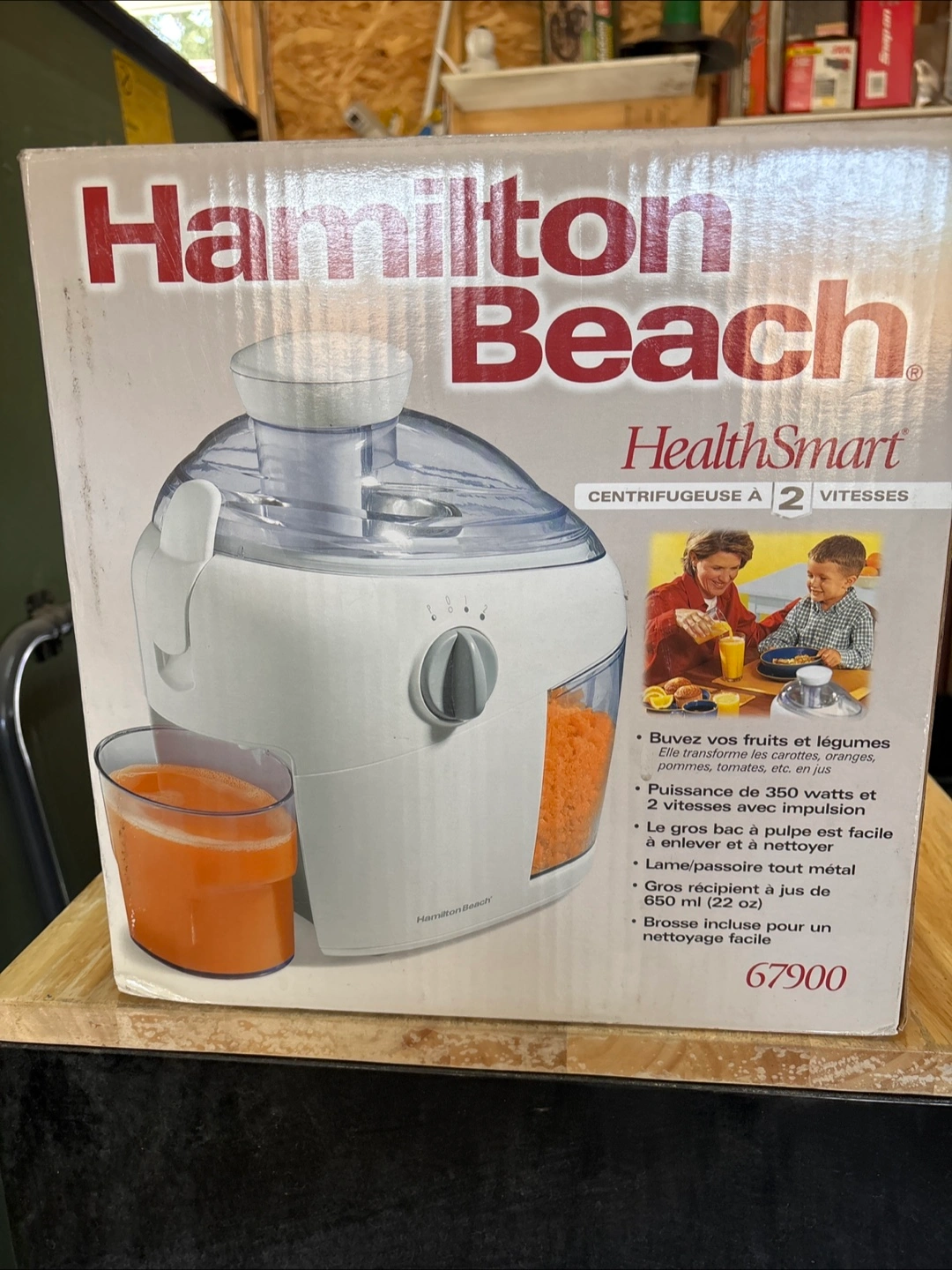 Hamilton Beach HealthSmart Centrifugeuse. Two speeds with pulse. Metal blade and strainer. Large pulp container. Easy to clean. Includes cleaning brush. 650ml (22 oz) juice container.