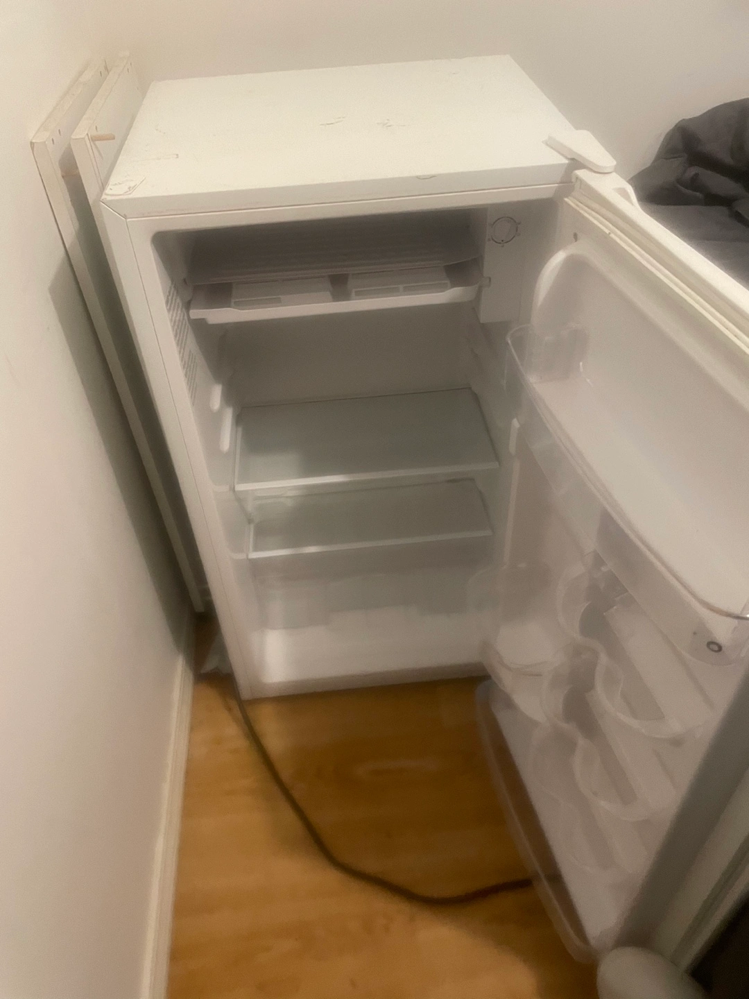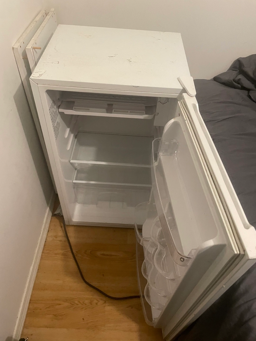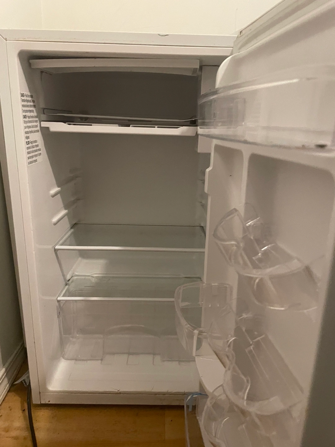 Small white mini fridge. Multiple shelves and door compartments. Used condition, minor cosmetic wear.