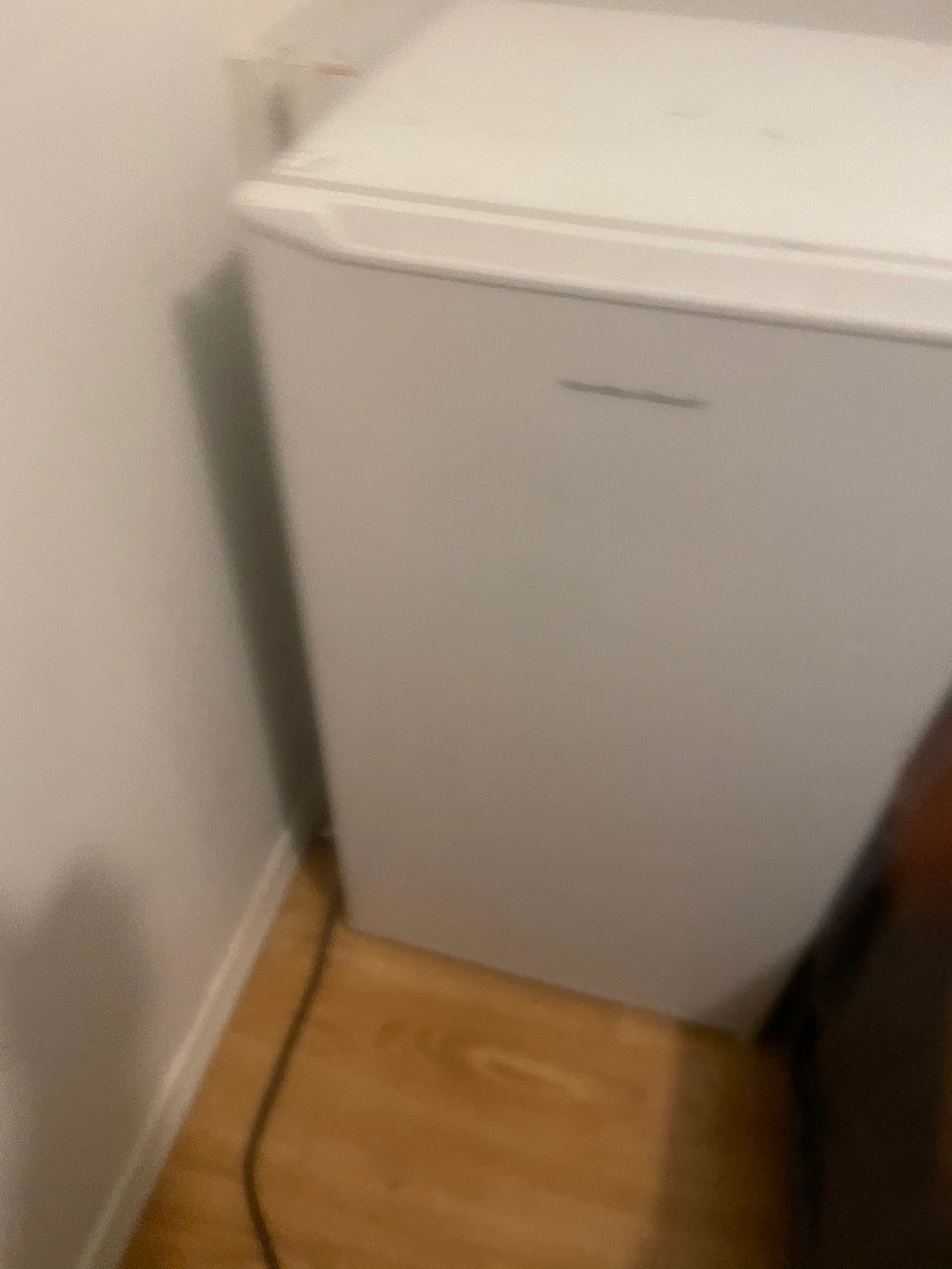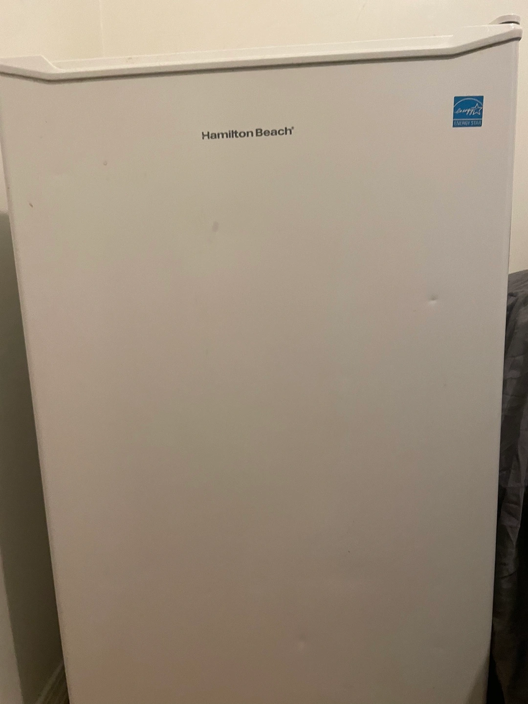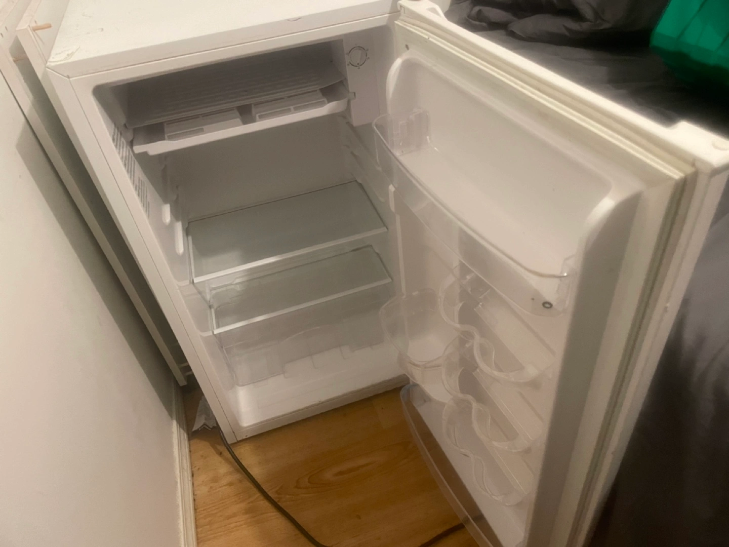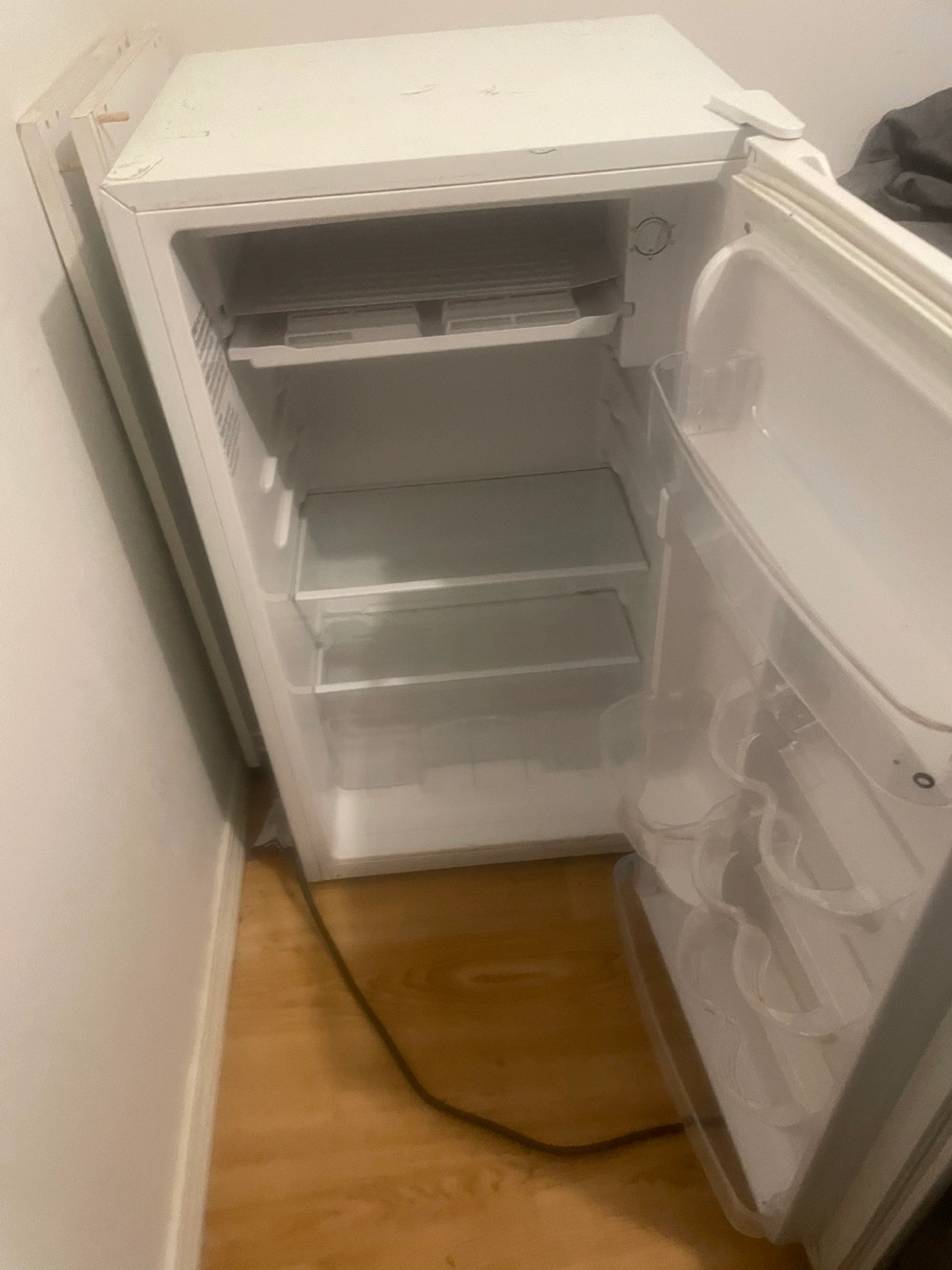 Small white mini fridge. Multiple shelves and door compartments. Used condition, minor cosmetic wear.