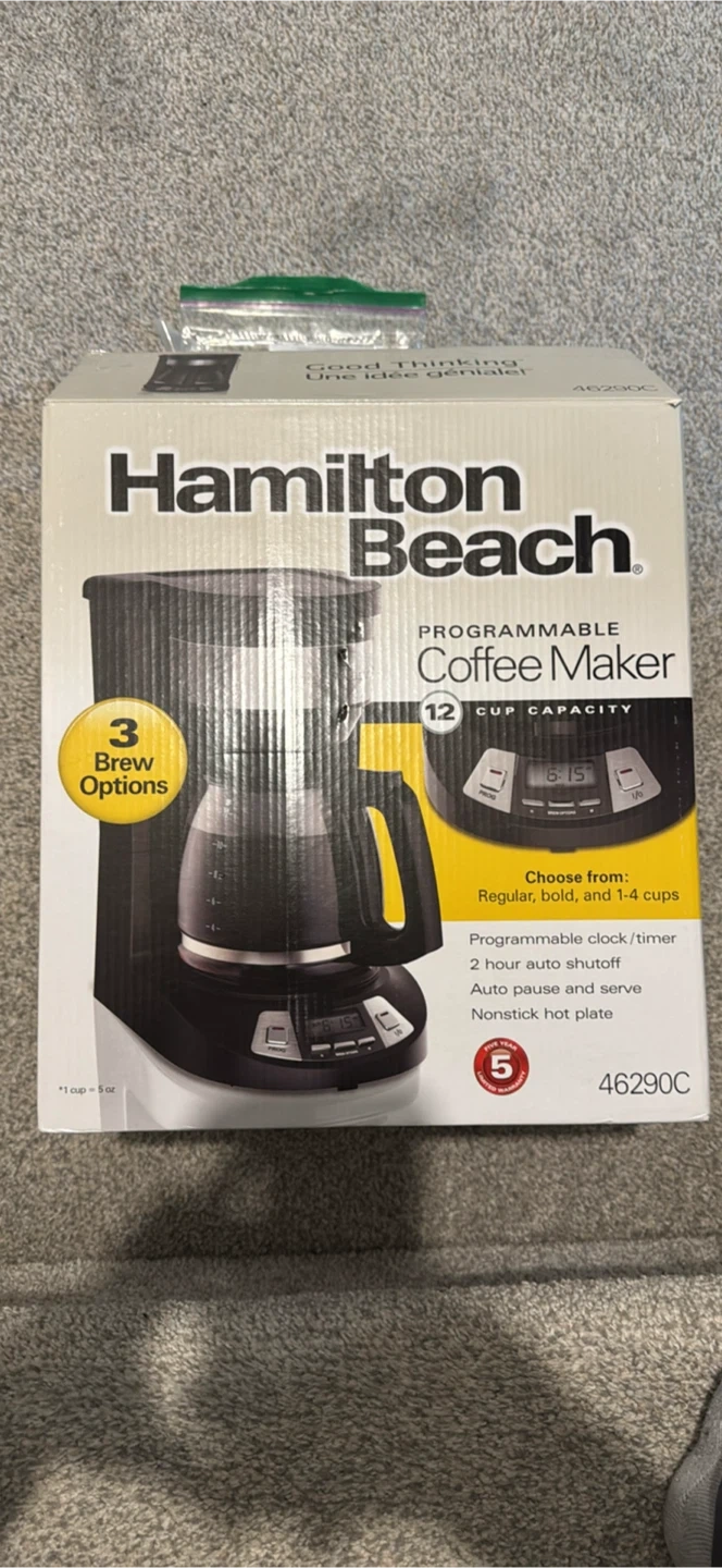 10Selling a Hamilton Beach programmable coffee maker! It has a 12 cup capacity and features 3 brew options. The coffee maker also has a programmable clock/timer, 2 hour auto shutoff, and a nonstick hot plate. Great for anyone who loves a good cup of coffee! Has been used once.