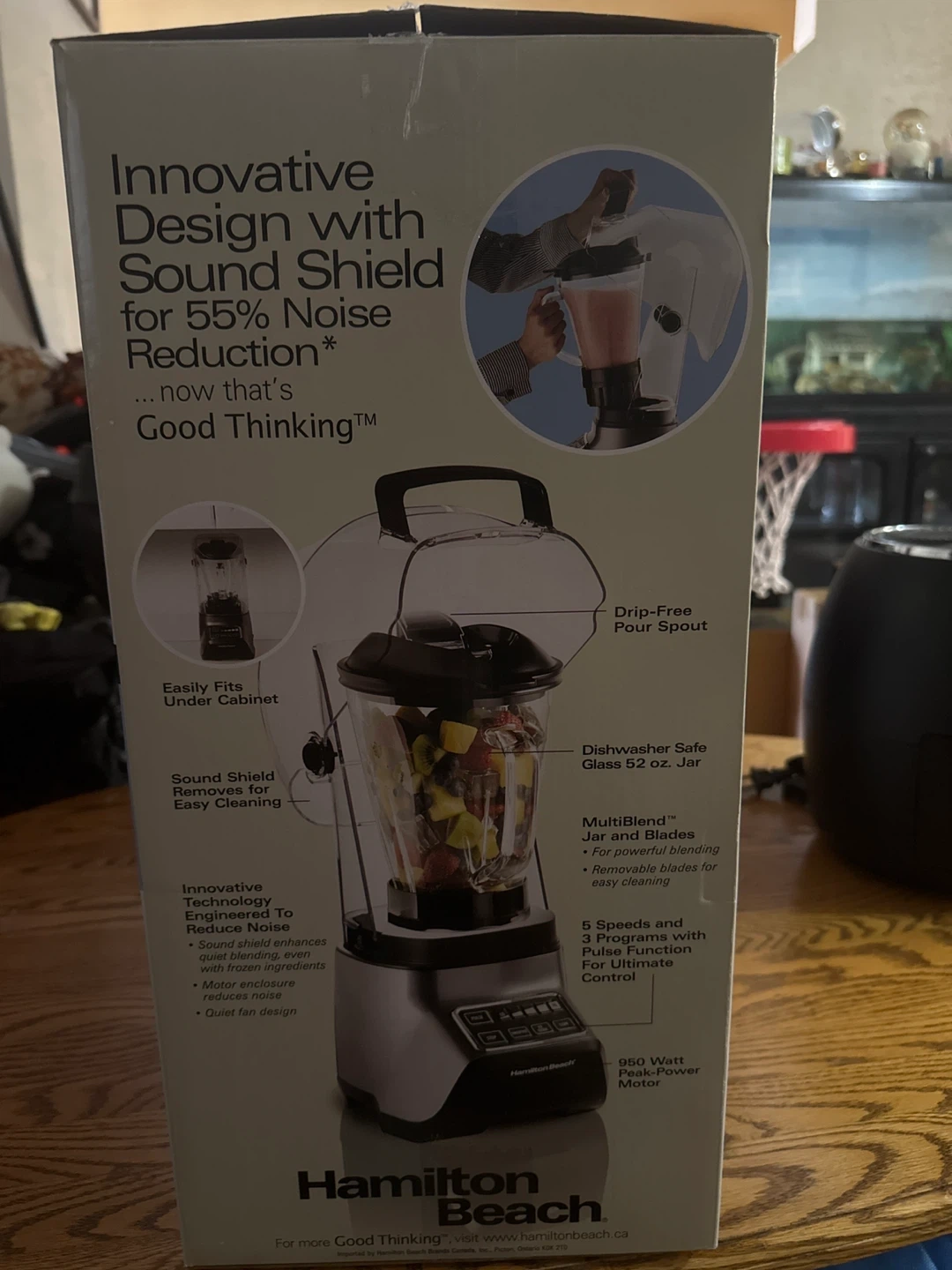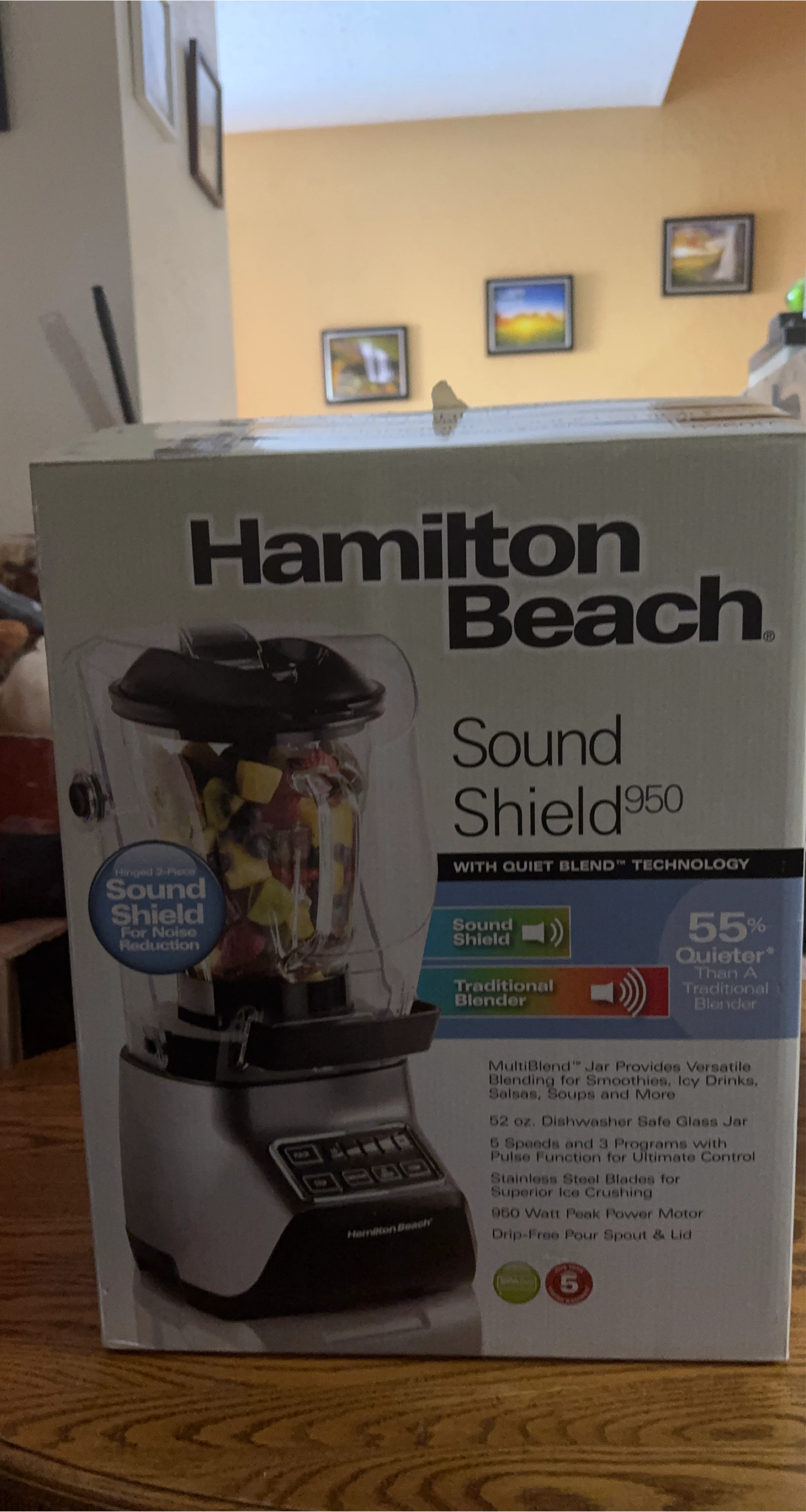 Selling a Hamilton Beach Sound Shield 950 blender. It comes with Quiet Blend Technology for 55% noise reduction. The MultiBlend jar provides versatile blending for smoothies, icy drinks, salsa, soups, and more. Features 5 speeds and 3 programs with infinite speed ultimate control. It also has stainless steel blades for superior ice crushing and a drip-free pour spout & lid