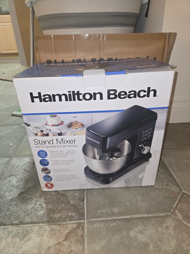Hamilton Beach stand mixer with 6 speeds and a fold setting! It has a powerful 300-watt motor to effortlessly mix bread doughs, thick batters, and more. Includes a durable 3.5-quart stainless steel bowl, dough hook, whisk, and flat beater. Complete bowl coverage with planetary mixing action ensures batters are thoroughly mixed. It comes in the original box too