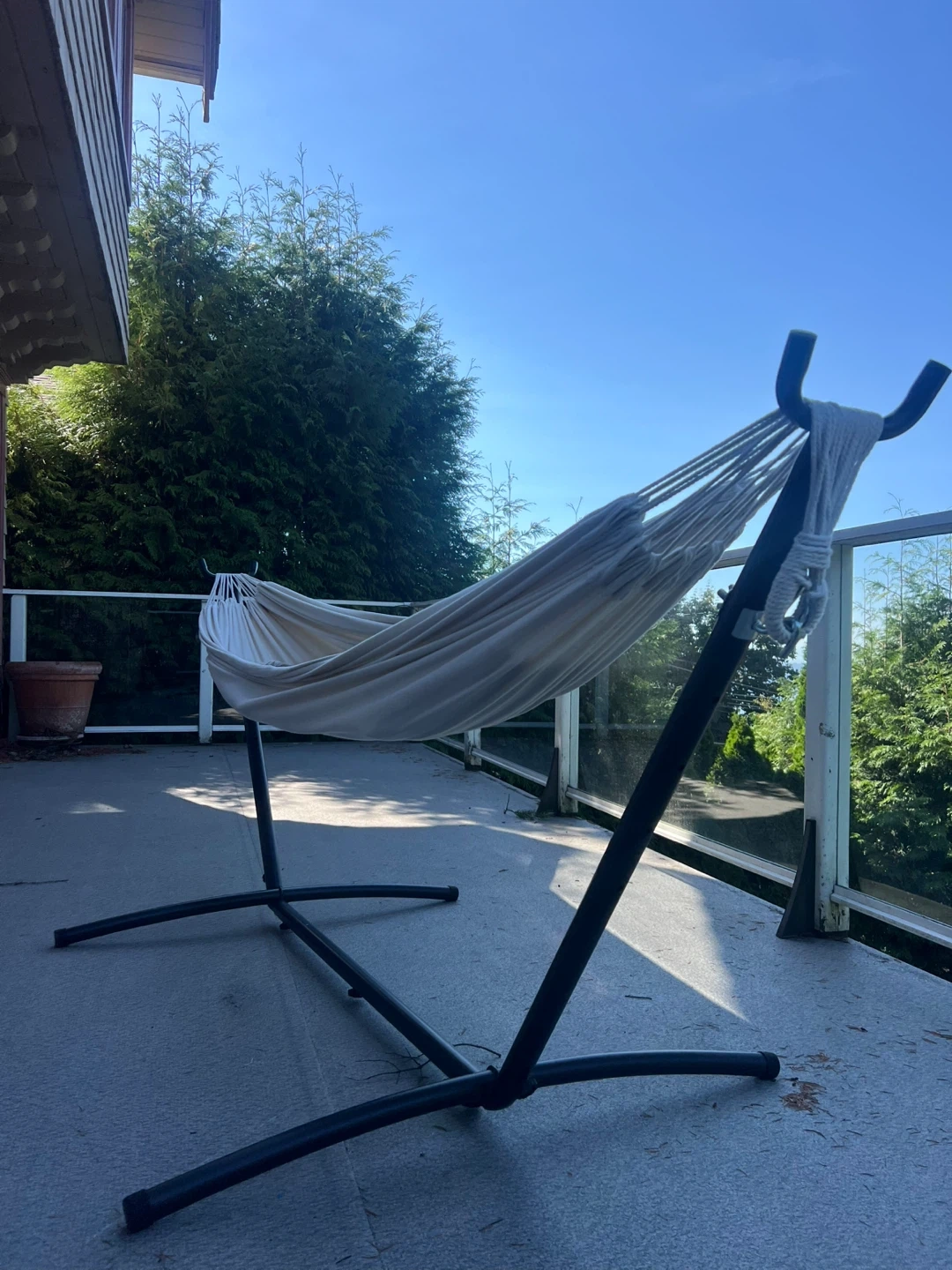 48Looking to sell my hammock with stand! It's in great shape and perfect for relaxing on the patio or in the backyard 8.9x3.6x3.5 ft Comes with a bag for easy transport and seasonal storage. Very easy to disassemble. 2 Person Hammocks up to 450lbs Get ready to relax! Pickup in North Vancouver