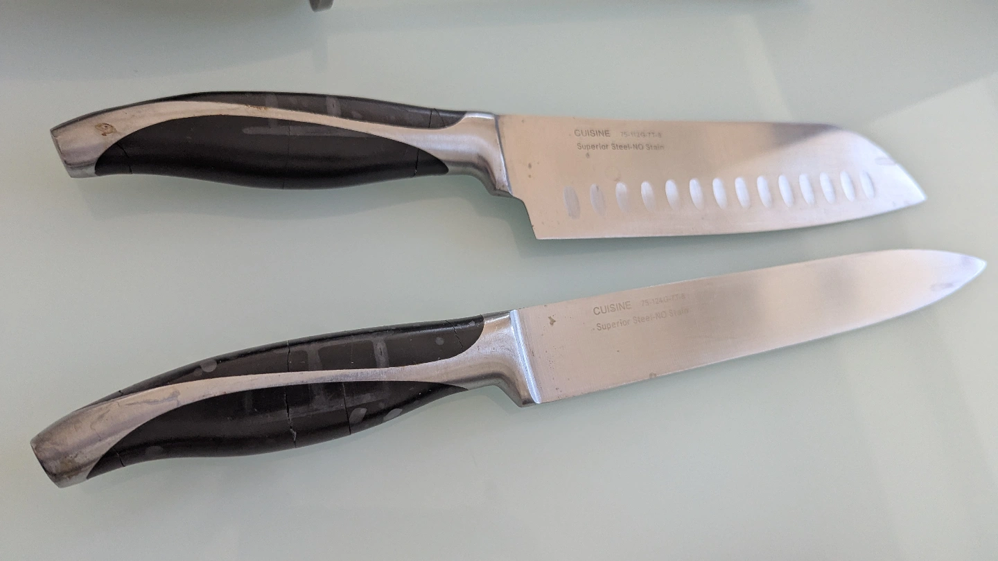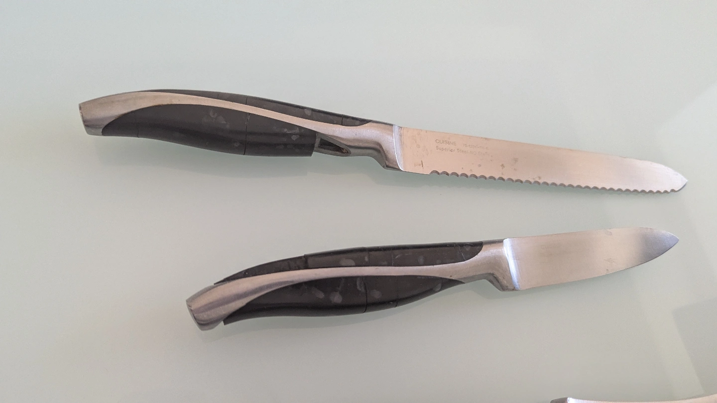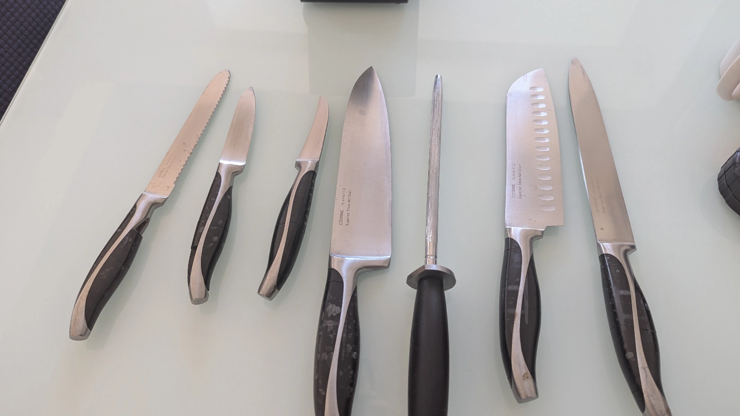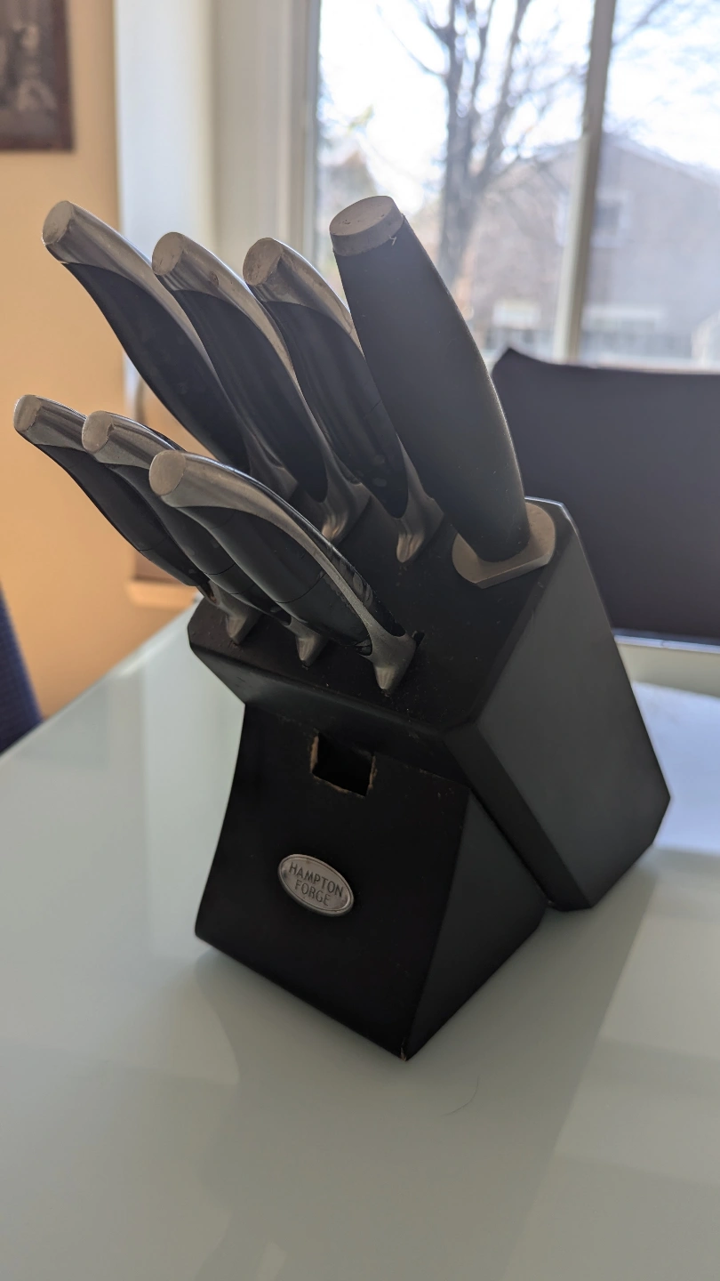 Seven-piece knife set with black handles and a wooden block. Includes various knives, a honing steel. Stainless steel blades.