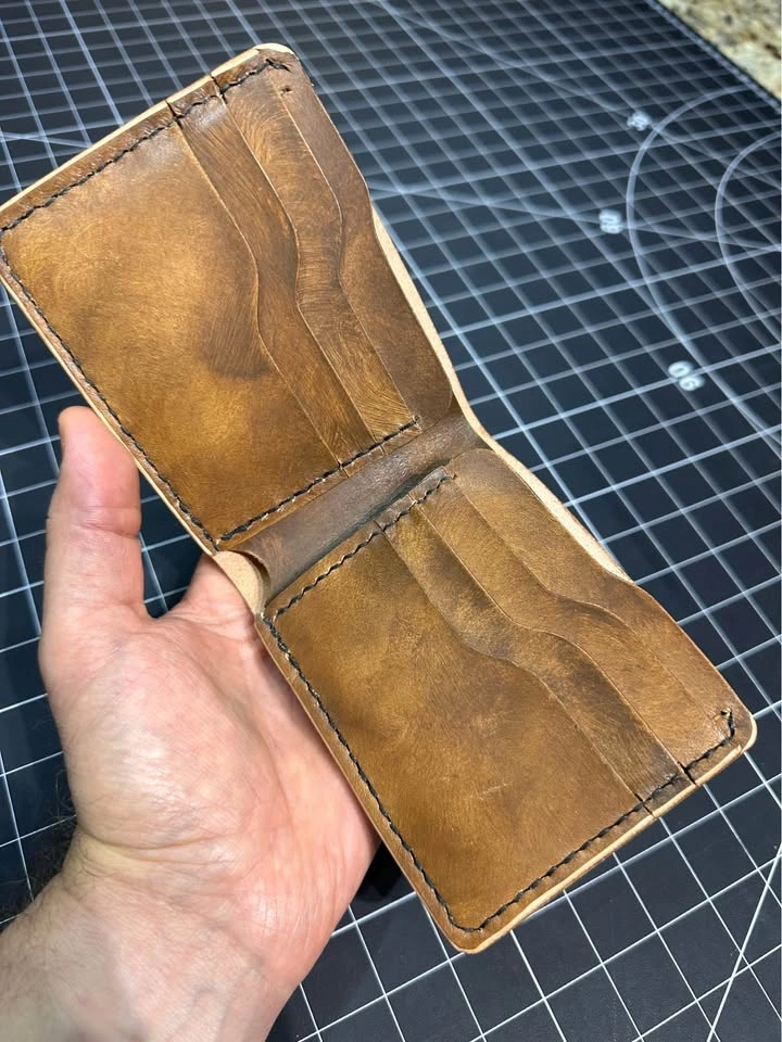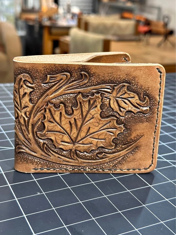 65This handcrafted bifold wallet is made from full-grain vegetable-tanned leather and decorated with a deep, hand-carved maple leaf motif on the exterior. Every line and texture is tooled by hand, giving each piece a unique character and a warm, natural patina that will only get better with time. Inside, the wallet includes 6 card slots, 2 hidden side pockets for checks/receipts/papers, and a full-length cash compartment. Everything is hand-stitched with durable waxed thread and hand-dyed for a rich, natural finish. Features • Hand-carved maple leaf floral tooling • Premium full-grain vegetable-tanned leather • 6 card slots + 2 hidden pockets + cash compartment • Hand-dyed, hand-stitched, hand-finished • Ages beautifully with use • Made entirely by hand in Canada Capacity • Holds 6–12 cards comfortably • Side pockets fit receipts, checks, folded papers, or extra cards • Fits CAD & USD currency This wallet is ideal for someone who values real craftsmanship, natural materials, and timeless style — not mass-produced goods.