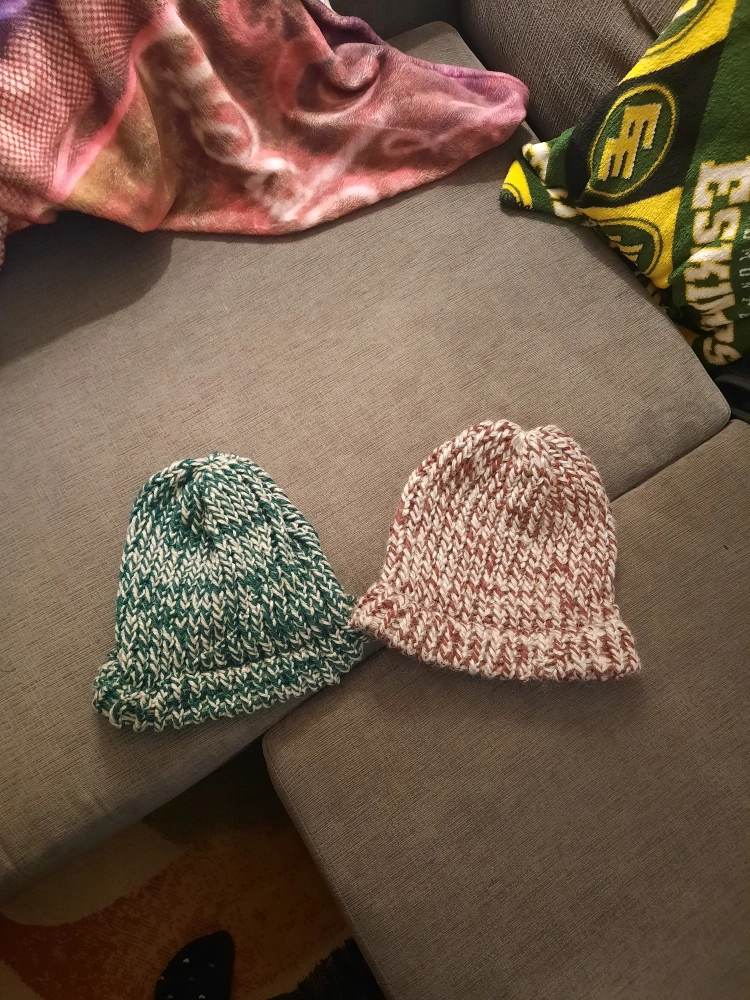 Selling a couple of cozy hand-knitted beanies! One is a lovely green and white, and the other is a warm brown and white. Perfect for keeping your head warm during the colder months