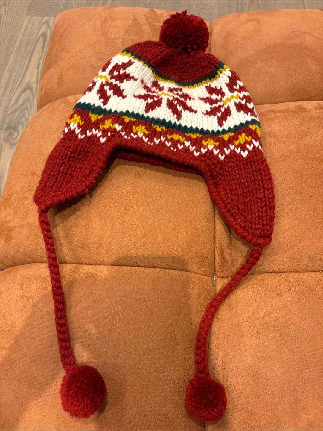 26Cozy up this winter with this adorable hand-knitted hat! It features a charming snowflake pattern in red, white, green, and yellow, complete with fun pom-poms. Perfect for keeping warm and adding a touch of whimsy to your winter wardrobe