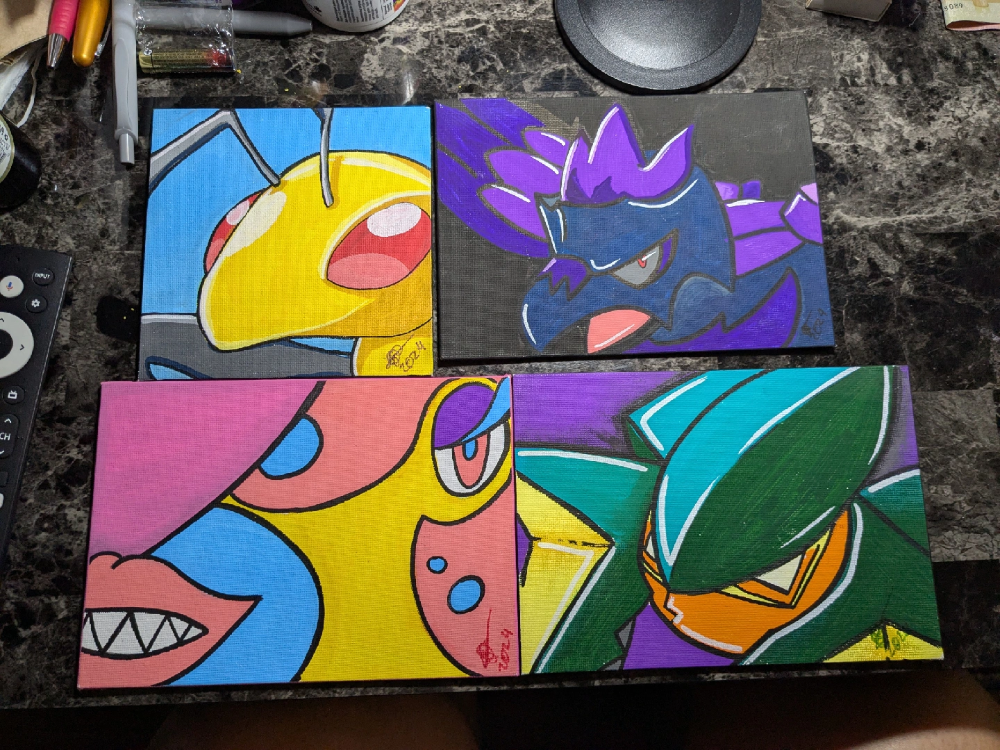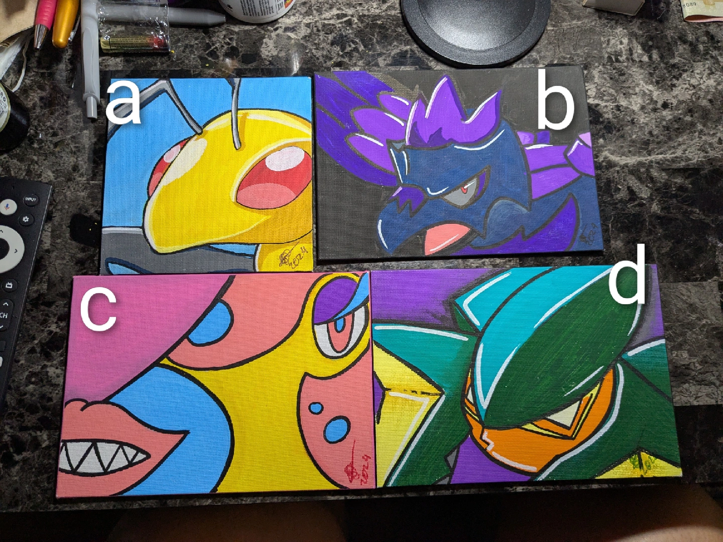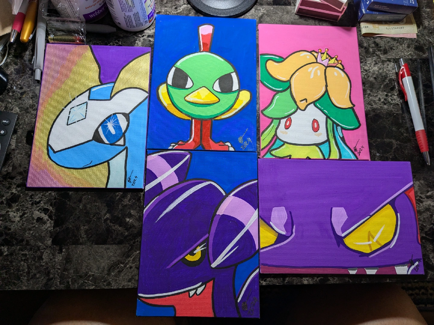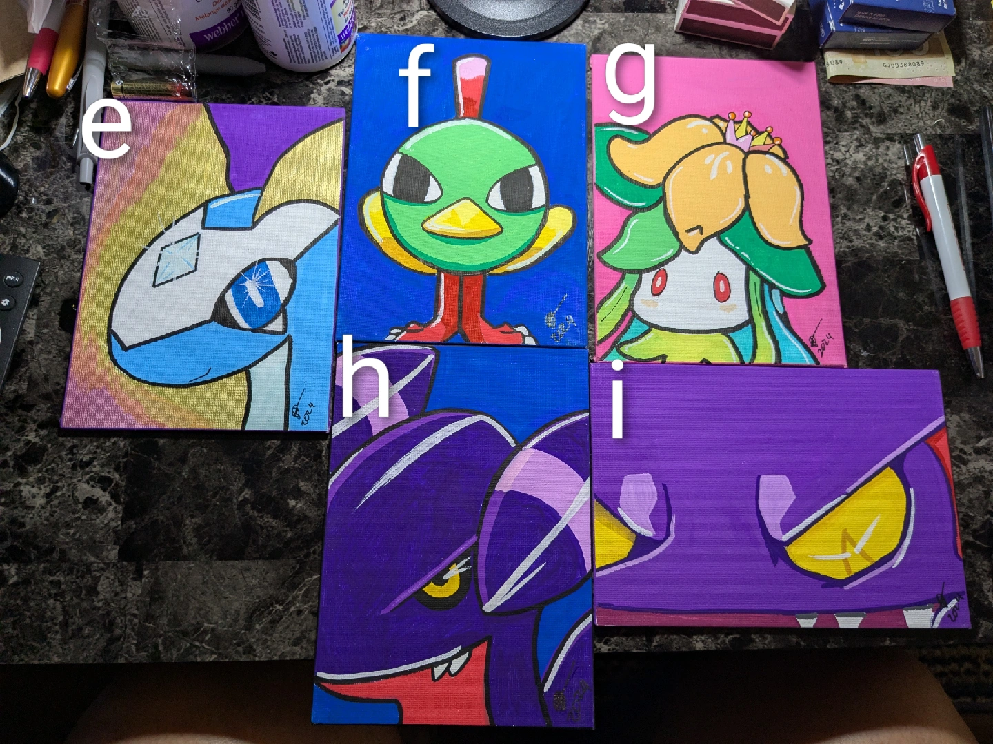 15hand painted Pokemon on canvas board tiles, two sizes: 5"X5" and 5"x7" posca acrylic markers used. not sealed. original pieces, no duplicates. once they're gone, they're gone. just let me know which letter you're interested in!