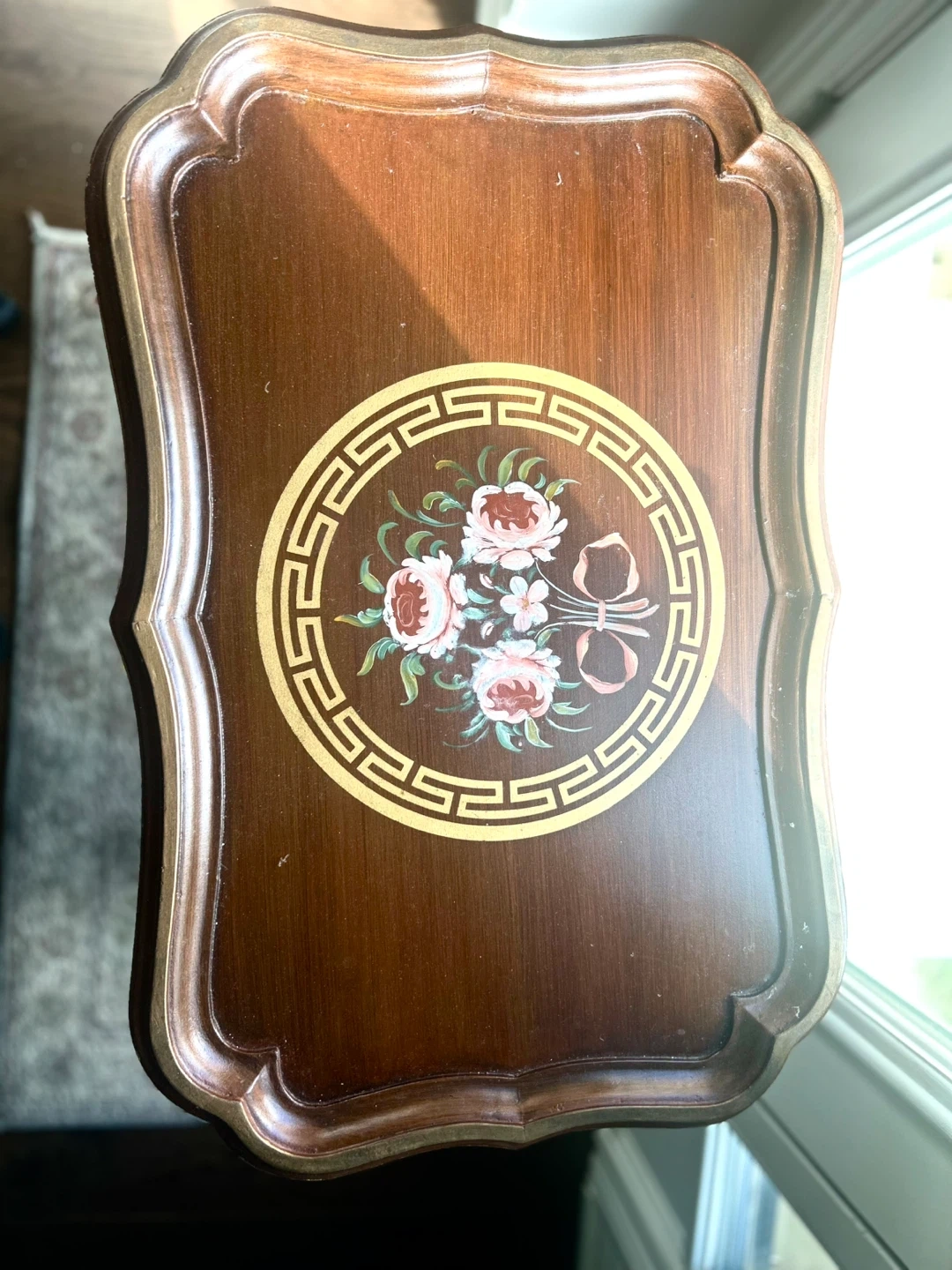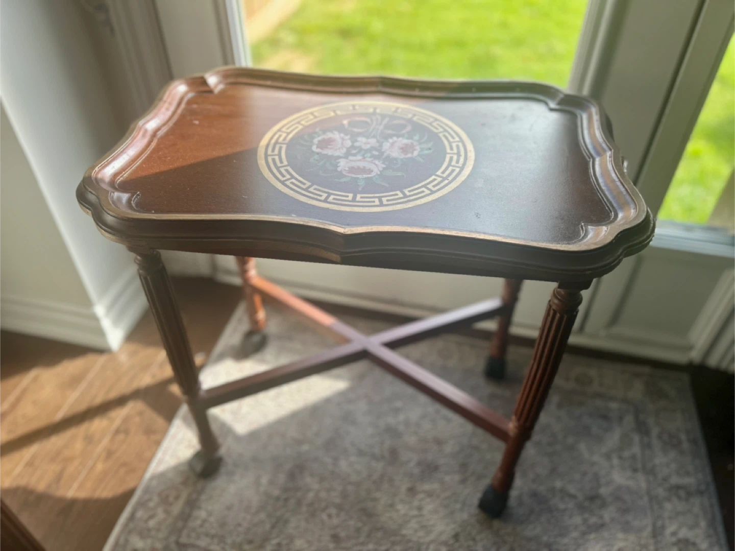 16Selling a lovely vintage accent table! It's made of brown wood with a unique floral design on the top. Perfect as a side table or for adding a touch of vintage charm to your space 2 pieces available