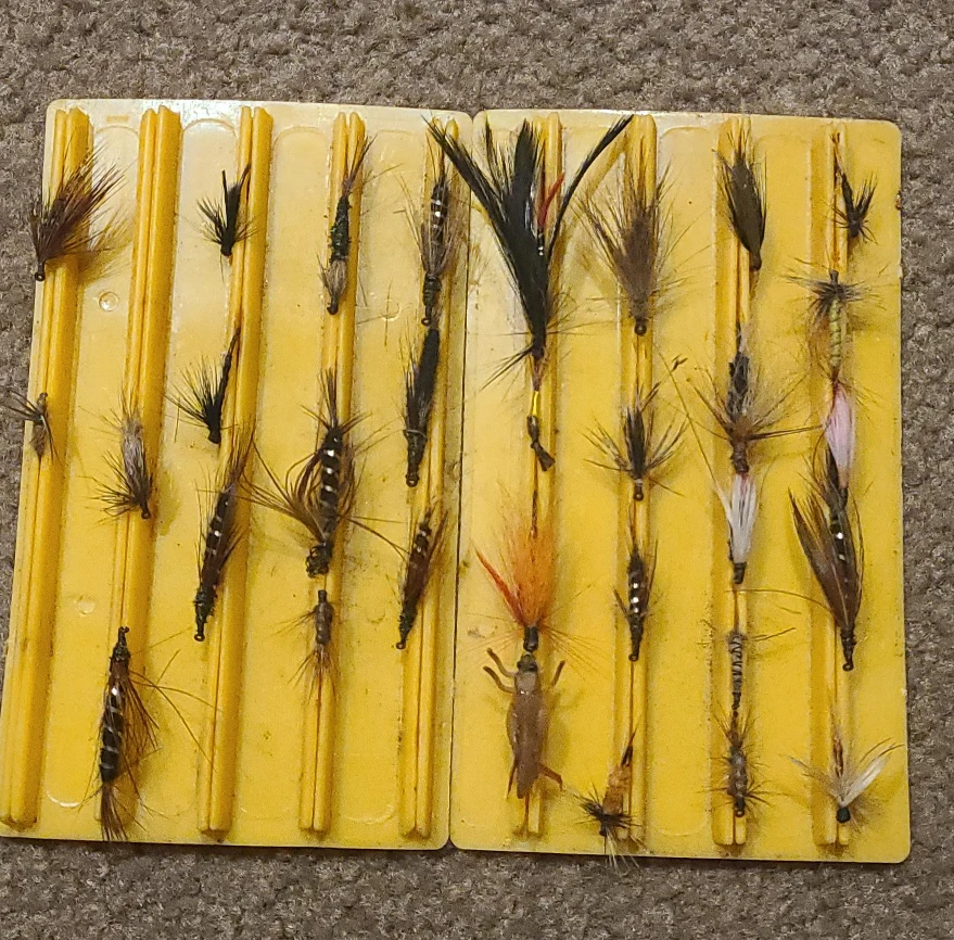 0Vintage set of hand-tied fishing flies. They come in a variety of styles and colours, perfect for your next fishing trip!